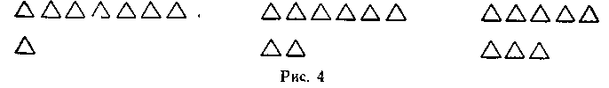 Стр. 39 Используя те же числа, учитель может предложить и другое задание, которое также будет характеризоваться одинаковым содержанием, но различными способами выполнения, например: “Используя данные числа, составьте уравнения, в которых неизвестное равно нулю”. (x+5=5, x + 4 = 4, 4—х = 4 и т. д.) При анализе задания учитель может подвести детей к обобщению, предложив им сравнить все записанные уравнения и указать на их особенность, хотя не исключена возможность, что некоторые ученики сами обратят внимание на это уже в процессе выполнения работы. Рассмотрим в качестве примера задание геометрического содержания (оно взято из книги: Пышкало А. М. Методика обучения элементам геометрии в начальных классах. М., 1973): “Разделите четырехугольник отрезком на части так: 1) чтобы обе части были треугольниками; 2) чтобы обе части были четырехугольниками; 3) чтобы одна часть была треугольником, а другая четырехугольником; 4) чтобы одна часть была треугольником, а другая — пятиугольником”. Приведенное задание позволяет учителю организовать самостоятельную работу в классе, используя четыре варианта. Процесс выполнения задания, безусловно, требует от учащихся поиска. Преобразуем данное задание, т. е. изменим его инструкцию так, чтобы она отвечала особенностям заданий II вида: “Разделите четырехугольник отрезком на части так, чтобы получилось две геометрические фигуры. Какие это фигуры?” Задание в таком виде даст возможность каждому из учеников проявить свою индивидуальность, самостоятельность и творческую активность. Кроме того, сам процесс организации самостоятельной работы упростится, так как учитель предложит единое задание всему классу. В силу индивидуальных особенностей одни ученики могут ограничиться одним способом, другие — двумя, а третьи рассмотрят все возможные случаи. Систематическая работа по выполнению заданий II вида оказывает существенное влияние на развитие творческого подхода к ним, способствует проявлению индивидуальных особенностей ученика и тем самым формирует самостоятельность как черту личности, помогает каждому ученику поверить в свои возможности и совершенствовать их в процессе обучения. Эти задания, естественно, следует усложнять от класса к классу, но начинать нужно, безусловно, с самых простых. Лучше, если эти задания на началь- ном этапе будут носить практический характер. Например, в I классе при изучении задач на сравнение чисел учитель может предложить следующие задания: “Разложите 8 треугольников (у каждого ученика на парте набор треугольников) в два ряда так, чтобы в верхнем ряду треугольников было больше, чем в нижнем (рис. 4). На сколько треугольников в верхнем ряду больше, чем в нижнем?” Особенность такого задания опять же состоит в том, что его содержание одинаково для всех учеников класса, но способ его выполнения индивидуален. Каждый ученик должен обосновать свой вариант. При этом одни могут предложить сразу три способа, другие — два, а третьи — один. Каждый выполнит задание в силу своих индивидуальных возможностей. — Нарисуйте 7 кружков, а в нижнем ряду нарисуйте столько кружков, чтобы их было меньше, чем в верхнем. На сколько в верхнем ряду кружков больше, чем в нижнем? (Задание имеет шесть вариантов ответов.) Ко II виду можно отнести также задания, которые есть в учебнике и связаны с записью неравенств и 