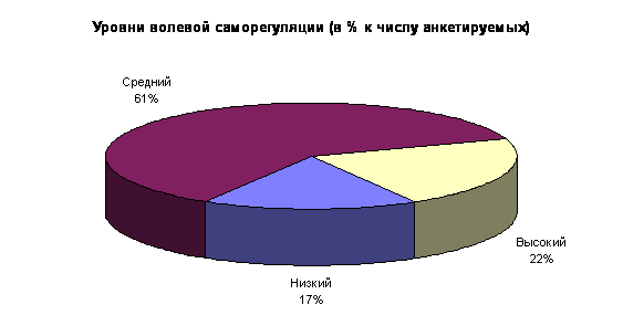Стр. 68 Диаграмма 1.4 – 2 Таким образом, из 179 опрошенных старшеклассников низкий уровень волевой саморегуляции присущ приблизительно 17% учащихся, средний – около 61% и высоким уровнем воли обладают примерно 22% учащихся. Сведя полученные данные в таблицу 1.4 - 6, имеем: Таблица 1.4 – 6