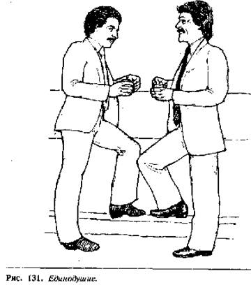 Стр. 106 Глава XIII ОтзеркаливаниеВ следующий раз, когда вы будете присутствовать на каком-нибудь официальном приеме, вечере или вечеринке, обратите внимание, что некоторые общающиеся между собой люди сидят или стоят в одинаковой позе и повторяют жесты друг друга. Это "отзеркаливание" является средством, с помощью которого один человек сообщает другому, что он согласен с его мнением и взглядами. С помощью этого средства один невербально говорит другому: "Как видите, я думаю так же, как вы, поэтому я копирую вашу позу и ваши жесты". Очень интересно наблюдать за этим подсознательным копированием. Посмотрите, например, на двух мужчин, изображенных на рис. 131, стоящих у стойки бара. Они отзеркаливают жесты друг друга, и можно предположить, что их мысли и чувства совпадают. Как только один человек скрещивает руки или ноги, другой делает то же самое. Как только один из них кладет руку в карман, другой повторяет его жест, и это копирование будет продолжаться до тех пор, пока они пребывают в согласии между собой. Это копирование часто присутствует в общении людей одинакового социального уровня, близких друзей, и часто можно увидеть, как одинаково ходят, стоят, сидят или двигаются супружеские пары. Шефлен заметил, что незнакомые между собой люди старательно избегают при общении одинаковых поз и положений тела. Отзеркаливание имеет огромное значение, поскольку это один из способов показать собеседнику, что вы с ним согласны, и он вам нравится. Сделать это можно простым копированием его жестов. Точно также по отзеркаливанию мы можем определить, что мы нравимся собеседнику, и он с нами согласен. Если вы хотите установить полное взаимопонимание со своим подчиненным и создать непринужденную атмосферу, единственное, что вам нужно сделать, это скопировать его позу, и вы добьетесь цели. Аналогичным образом, перспективный, подающий надежды сотрудник фирмы может копировать жесты своего босса в попытке достигнуть взаимопонимания. Используя отзеркаливание, можно оказывать влияние на результаты вашей беседы с глазу на глаз с другим человеком. Копирование его жестов и позы поможет вам расположить этого человекак себе, поскольку он видит, что вы понимаете и разделяете его точку зрения (рис. 132). |