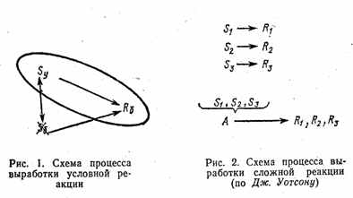 Стр. 43 А как же образуются сложные реакции? По Уотсону — путем образования комплексов безусловных реакций. Предположим, имеется такая ситуация: первый безусловный стимул вызвал первую безусловную реакцию, второй — вторую, третий — третью. А потом все без условные стимулы заменили на один условный стимул (А). В результате условный стимул вызывает сложный комплекс реакций (рис. 2). Все человеческие действия и есть, по мнению Дж. Уотсона, сложные цепи, или комплексы, реакций. Если вдуматься в это его утверждение, то станет "ясно, что оно абсолютно неверно. В действительности из приведенной схемы невозможно понять, как появляются новые действия человека: ведь организм по концепции Дж. Уотсона располагает только арсеналом безусловных реакций. Один современный математик-кибернетик, М. М. Бонгардт, на этот счет замечает, что никакие раздражители и никакие, их сочетания никогда бы не привели по схеме образования условных реакций, например, к тому, чтобы собака научилась ходить на задних лапах. И в самом деле, безусловной реакцией на свет может быть мигание, на звук — вздрагивание, на пищевой раздражитель— выделение слюны. Но никакое сочетание (цепь или комплекс) подобных безусловных реакций не даст хождения на задних лапах. Эта схема не выдерживает никакой критики. Теперь об экспериментальной программе Дж. Уотсона. Он считал, что психолог должен уметь проследить жизнь человека от колыбели до смерти. “До смерти”, по-видимому, не была прослежена бихевиористами жизнь ни одного человека, а вот к '“колыбели” Дж. Уотсон обратился. Он обосновал свою лабораторию в доме ребенка и исследовал, как я уже говорила, новорожденных детей и младенцев. Один из вопросов, который его интересовал, был следующий: какие эмоциональные реакции врожденны у человека и какие нет? Например, на что появляется страх у новорожденного ребенка? Этот вопрос особенно интересовал Дж. Уотсона, поскольку, согласно его замечанию, жизнь взрослых полна страхов. Не знаю, действительно ли страшно было жить в те годы в Америке, но Дж. Уотсон приводит на этот счет целый перечень примеров: знакомого мужчину, который бледнеет при виде пушки; женщину, которая впадает в истерику, когда в комнату влетает летучая мышь; ребенка, который буквально парализуется страхом при виде механической игрушки. “Что же все эти страхи: врожденны или нет?”—задает себе вопрос Уотсон. Чтобы ответить на него, он проводит в доме младенца следующие эксперименты. |