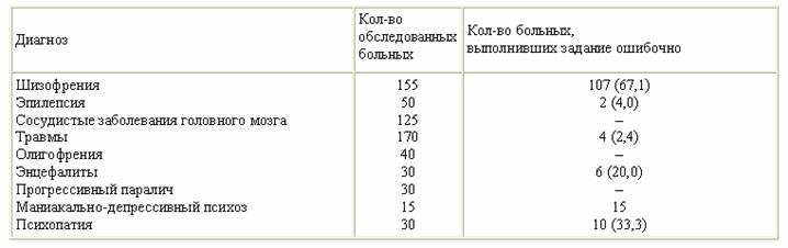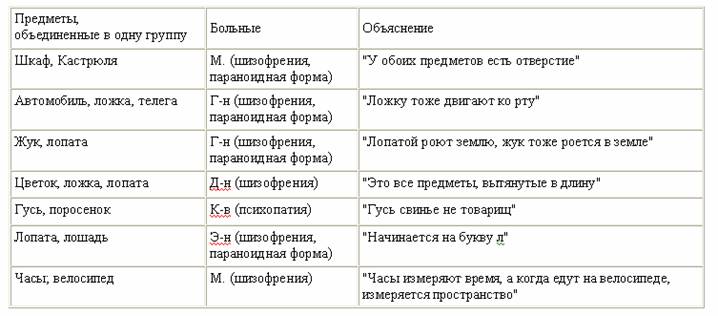 Стр. 224 Таблица 6 Ошибки типа формальных, бессодержательных сочетаний Подобные больные живут в мире своих бредовых переживаний, мало интересуются реальной обстановкой, пытаются к незначительным, обыденным явлениям подходить с "теоретических позиций". В беседе они способны затронуть вопросы общего характера, но часто не в состоянии ответить просто на конкретный вопрос. Речь больных носит вычурный характер. Так, например, говоря о шкафе, один такой больной называет его "ограниченной частью пространства", рассказывая о товарище, которого он характеризовал как доброго человека, замечает: "Что такое добро и зло? Это определение относительно, положительное и отрицательное, как вопрос об электронах и вселенной. Плохое — это качественная сторона, значит, надо хорошую. Но плохое может сойти за хорошее, противоположности не бывает". Таблица 7 Примеры выполнения задания "классификация предметов" В табл. 7 приведены наиболее показательные примеры того, как подобные больные, выполняют задание на классификацию предметов. Они проводят ее либо на основании столь общих признаков (твердость, движение), что выходят за пределы содержательной стороны явлений, либо на основании чисто внешних, несущественных признаков (отверстие). Особенно отчетливо бессодержательный, выхолощенный характер суждений больных определенной категории выступает при выполнении задания на составление пиктограммы. Так, один из больных рисует для запоминания слов "теплый ветер" два треугольника, для запоминания выражения "веселый ужин" — два кружка. Другой больной этой группы для запоминания слова "сомнение" изображает сома, для слова "разлука" — лук. Для больных со снижением уровня обобщения задание составить пиктограмму представляет трудность в силу того, что они не могут отвлечься от отдельных конкретных значений слова. Это же задание позволило выявить и другую группу больных, которые выполняют его с большей легкостью, так как могут образовать любую связь, безотносительно к содержанию поставленной перед ними задачи. Условность рисунка становится столь широкой и беспредметной, что она не отражает реального содержания слова; больные могут, не задумываясь, предложить любую схему в качестве условного обозначения слова. |