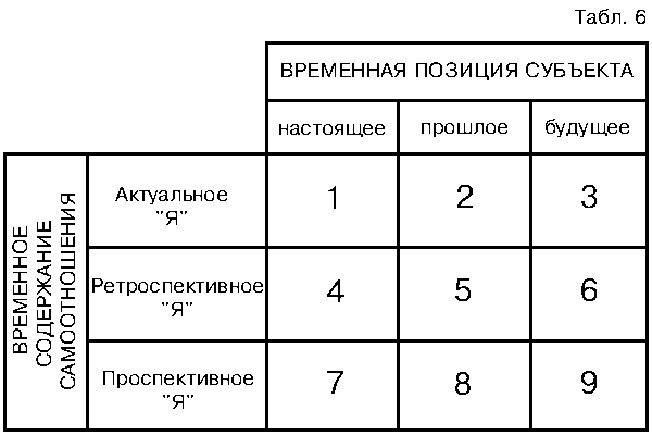 Стр. 102 Традиционным объектом исследования является актуальное "Я", тогда как об остальных двух указанных видах "Я" имеется относительно мало сведений. Это объясняется той простой причиной, что парадигма исследования самоотношения не всегда строится с учётом временного измерения. Актуальное "я" не сводимо к реальному или идеальному "Я", ретроспективное "Я" не простая форма биографической памяти, столь интенсивно изучаемое в настоящее время, оно еще и установочное отношение к личному прошлому; проспективное "Я" не сводится к т. н. потенциальному или желаемому "Я", оно более сложное образование, включающее сложные акты самопроектирования. Здесь мы подходим к очень важному пункту, на котором следует специально остановиться. Конституирование личностью временного измерения самоотношения многопланово. Имеется в виду то, что субъект не только строит образ того, какой он есть, каким он был и каким он будет, но и занимает определенную временную позицию, которая выступает своеобразной "точкой отсчета" и в перспективе которой субъектом моделируется "горизонт времени" этих образов. Если говорить проще, то, например, рассказывать о том, каким я был в прошлом, я могу и с позиции нужд настоящего и исходя из планов на будущее, и погрузившись или "переселившись" в отдаленное прошлое. Это позволяет нам выделить два момента временной структурированности самоотношения и образа "Я": (1) какой период собственной жизни имеется в виду, что является содержанием самоотношения – актуальное, ретроспективное или будущее "Я" и (2) исходя из какой временной позиции или в ракурсе какой перспективы настоящего, прошлого или будущего презентирован образ "Я". На основе соотношения этих двух моментов можно перечислить возможные способы временного конституирования самоотношения. Наглядное представление о них дает следующая таблица. В этом изображении дается 9 возможных вариантов: (1) актуальное "Я" с позиции настоящего, (2) актуальное "Я" с позиции прошлого, (3) актуальное "Я" с позиции будущего, (4) ретроспективное "Я" с позиции настоящего, (5) ретроспективное "Я" с позиции прошлого, (6) ретроспективное "Я" С позиции будущего, (7) проспективное "Я" с позиции настоящего, (8) проспективное "Я" с позиции прошлого, (9) проспективное "Я" с позиции будущего. О том, что наличие указанных возможных вариантов в построении образов "Я" эмпирически подтверждается, специально будет идти речь в экспериментальной части работы (глава V). Здесь же следует ограничиться указанием на то значение, которое может иметь учет этих возможных вариантов временного конституирования самоотношения в анализе содержаний самоописаний консультируемого или пациента во время психоконсультационного или психотерапевтического сеанса. Анализ того, (1) к какому периоду своей жизни приковано преимущественно внимание субъекта, какие собственные поступки и личностные черты не "переварены" им – те, которые совершаются ныне и присущи ему в настоящем или те, которые относятся к личному прошлому, и (2) с какой временной позиции осуществляется самооценка тех же поступков и личностных черт – в ракурсе ли сегодняшнего дня или отдаленного прошлого, в перспективе ли планов на будущее, – все это вместе взятое представляет необходимую и весьма ценную информацию для понимания внутреннего мира личности и коррекции ее неадекватных у