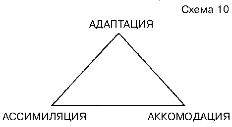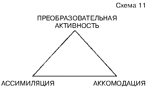 Стр. 105 В концептуальном аппарате Ж. Пиаже преобразовательная активность субъекта понимается как трансформация объекта и его включение в ассимиляторные схемы, а аккомодация – это приспособление или сообразование схем субъекта характеристикам объекта. Когнитивная адаптация включает в себя две полярно противоположных тенденции, что можно изобразить в виде следующего треугольника. Однако за простотой такого понимания, по нашему мнению, кроется определенная неточность, заключающаяся в некоторой односторонности и в преувеличении роли приспособления: с одной стороны, ассимиляцию можно понимать как приспособление к себе объекта, а аккомодацию как приспособление к объекту, к его характеристикам, и в таком случае действительно (ничего больше не остается сделать, кроме как объединить эти две противоположные тенденции в одно более общее – в аддитивную активность; однако, с другой стороны, ассимиляцию мы можем понимать как трансформацию (преобразование) субъектом объекта, а аккомодацию как преобразовательное воздействие объекта на субъект и в таком случае в качестве объединяющего их момента может выступить преобразовательная активность. Если при таком ходе рассуждения мы допустим, что сущность психического развития и человеческой деятельности заключается в преобразовательной активности, то вышепредставленный треугольник придется заменить новым, где место когнитивной адаптации займет преобразовательная активность или когнитивное преобразование. Это изображение в той же степени имеет свое логическое оправдание, как и предыдущее. Так же, как адаптация не может проходить в форме пассивной имитации и "следований" психических (например познавательных) структур за объектами, а с необходимостью включает в себя момент трансформации объекта и его приспособление к себе, настолько же преобразовательная активность не может осуществляться в виде трансформации объекта, не приспособившись к его характеристикам. Это, в свою очередь, дает нам право заключить, что человеческая деятельность в плане модальности включает в себя две полярно противоположные разновидности – адаптивную и преобразовательную активность. Каждая из них, в свою очередь, включает моменты ассимиляции объекта и аккомодации к нему. Сказанное можно изобразить следующим образом: |