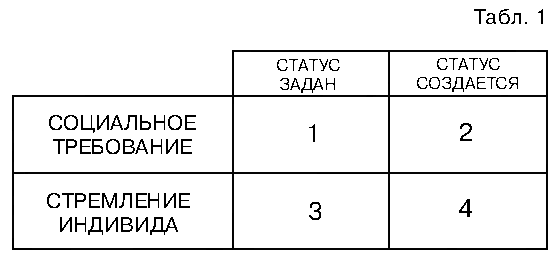 Стр. 56 Итак, мы рассмотрели заданность и "создаваемость" статуса под углом зрения того, что требует социальная среда и к чему индивид стремится. Теперь сделаем несколько шагов в направлении дальнейшей систематизации и конкретизации сказанного. С этой целью мы предлагаем взять две исходные оси с противоположными полюсями: (1) социальное требование – стремление индивида и (2) заданность социального статуса – "создаваемость" социального статуса. Если теперь вращать эти оси в отношении друг друга, то получим четыре варианта возможных статусных состояний, которые схематически можно изобразить следующим образом: Вычлененные таким образом четыре варианта возможных статусных состояний являются исходным. Первым является тот вариант, когда социальное требование относится к тому, чтобы члены группы или сообщества жили в режиме внешней заданности социального статуса. Согласно смыслу второго состояния социальное требование заключается в том, чтобы каждый своими усилиями добивался создания определенного общественного положения. Третий вариант уже говорит о том, что лицо само стремится функционировать в режиме внешней статусной заданности. Четвертый же вариант означает, что лицо стремится путем личной активности завладеть своим социальным положением. Мы отметили, что приведенные варианты являются исходными. Слово "исходный" содержит здесь некий намек на то, что в дальнейшем мы будем оперировать выделенными вариантами возможных состояний с целью определения более конкретных комбинаторных возможностей. В работе Ф. Е. Василюка [15], ссылающегося на методолого-типологические приемы О. И. Генисаретского, в рамках совершенно другого понятийного аппарата часто встречаются примеры успешного применения схем, подобных выше изображенной. Однако мы можем указать на два существенных различия между тем, что и как проделано в работе Ф. Е. Василюка и в нашей работе: 1) Ф. Е. Василюк нацелен на выделение категориально-типологических единиц, тогда как наша задача состоит в экспликации виртуальных состояний системы; 2) в работе Ф. Е. Василюка обычно выделяются по четыре определенные категориально-типологические единицы и далее следует их тонкое психологическое описание. Наш же "расчёт вариантов" идет дальше: выделяя для начала четыре исходных абстрактно-возможных варианта, мы подготавливаем почву для второго этапа определения возможных, вернее, конкретно-возможных состояний системы "личность – социальная среда". На этом втором этапе высчитываются отдельные комбинаторные возможности на основе сложения уже установленных четырех исходных вариантов. |