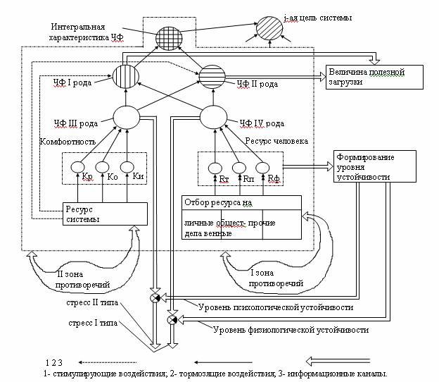 Стр. 191 Если считать, что человек ориентирован на выполнение для системы заданной полезной работы, а отбор ресурса на другие работы находится в противоречии с ресурсными возможностями человека, то можно говорить о существовании зоны противоречия между производственной деятельностью человека и отбираемым у него ресурсом на различную отвлекающую деятельность (1 зона противоречия). Другая зона противоречия образуется между потребностями человека в мотивации (стимулировании) и комфортности и ограниченными возможностями самой системы (2 зона противоречия), т.е. система не может неограниченно тратить свой ресурс на стимулирование какого-либо индивидуума, потому что ее ресурс ограничен и, кроме того, должен выполняться принцип справедливости распределения ресурса между людьми, входящими в систему. Нарушение последнего принципа приводит к целому ряду патологических проявлений ЧФ как со стороны тех, кто распределяет ресурс системы, так и тех, кто незаслуженно использует его. "Человеческий фактор ij-ой ориентированности - это относительный показатель работы человека (негативные и позитивные отклонения от задания, от норм и т.д., оцениваемые с точки зрения интересов системы), находящегося на i-м месте в иерархии управления, при осуществлении им управления по заданной j-й цели в зависимости от действия различных внешних и внутренних стимулов, комфортности обстановки, наличия у человека достаточного внутреннего ресурса и отбора части этого ресурса на посторонние дела"[31, С.229]. Все виды проявления ЧФ могут быть связаны в единый комплекс, структура которого представлена на рис.1.3.3 Рис.1.3.3. Иерархическая структура проявления человеческого фактора с учетом возможности нарушений физиологической и психологической устойчивости (стрессы 1 и 2 типа) Учет ЧФ и его использование в целях управления становится возможным при организации управления по принципу гомеостата. "Исходя из идеи гомеостатического управления, можно сформулировать большое число моделей поведения человека с управляемым внутренним противоречием, обладающих высокой устойчивостью и адаптивностью к действию различных неблагоприятных факторов" [31, С.244]. Последним видом классификации антропотехнических систем класса В, входящим в указанную выше минимально необходимую совокупность видов классификации систем, анализ которой обеспечивает обоснованный выбор методов их формализованного отображения и проектирования, является классификация проектируемой системы по природе ее системообразующих связей (по субстанциональному характеру взаимодействия элементов в системе или физическому виду основных управляющих воздействий и продукта системы). Данный вид классификации систем призван на основе анализа наполнения (вещественно-энергетическое, информационное) основных каналов связи системы, субстанционального вида средств деятельности и продуктов системы (вещество, энергия, информация) и технологии преобразования исходного продукта (сырья) в конечный продукт системы служить базовой основой для определения основных показателей функционирования и критериев эффективности системы, а также адекватных средств формализации отображения функционирования систем на основе этих показателей и критериев. Рассматриваемая классификация систем является одним из наименее раз