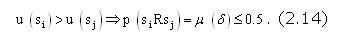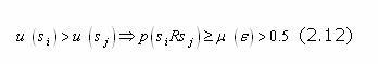 Стр. 228 Большинство критериев, используемых на практике, являются косвенными. Из (2.8) и графика на рис.2.1.1 следует, что для косвенных критериев; Согласно (2.12), косвенный критерий реализует принцип: с вероятностью не меньшей чем m(d), большему значению критерия соответствует лучшая (худшая) система. Косвенный критерий в определенной мере отражает отношения предпочтительности, установленные ЛПР на множестве S. Однако связь между этими отношениями и значениями критерия носит не функциональный, как у представительных критериев, а вероятностный характер. Это существенно усложняет интерпретацию результатов сравнения систем по косвенным критериям. Так, если для системы Si имеем отношение (2.11) по косвенному критерию, то отсюда можно сделать лишь заключение, что с вероятностью m(d) оптимальная система So имеет значение критерия, заключенное в интервале Если ЛПР величина вероятности m(d) покажется недостаточной для принятия решения о выборе оптимальной системы, она может быть увеличена за счет введения дополнительных показателей, характеризующих ту же самую цель, что и исходный критерий. В [83, С.153-155] сформулирован следующий подход к формированию набора (вектора) косвенных показателей (критериев), характеризующих данную цель: 1. Выявляется множество U всех показателей ui(S), по которым можно судить о степени соответствия системы цели А. 2. Для каждого показателя ui Î U, найденного на первом этапе, определяются величины di и значение mi(di). Кроме того задают величину mo - нижнюю границу представительности, необходимой ЛПР для принятия решения о выборе лучшей системы. 3. Показатели ui Î U располагаются в порядке убывания значений mi(di), после чего им присваиваются новые номера так, чтобы i< j Þ mi(di)³ mj(dj). 4. Из полученной последовательности векторов формируются следующие показатели: u1=u1, u12=(u1,u2), u123=(u1, u2, u3) и т.д. Затем с помощью ЛПР определяют значения представительности m1(d1), m12(d12) и т.д. На n-ом шаге оказывается, что для вектора un=(u1... un) величина mn(dn) > mo. Тогда un - вектор показателей наименьшей размерности, позволяющий производить оценку отношений предпочтительности систем с требуемой представительностью принимается в качестве критерия эффективности. При сравнении систем si,sjÎS, отличающихся по значению U(S) на величину d (см.рис.2.1.1), для непредставительного критерия имеем: При m(d)=0,5 критерий не несет никакой информации об отношении предпочтительности систем sÎS. Из (2.14) следует, что при m(d)=0,5 p(si R sj) = p(sj R si) =0,5. В случае, если |