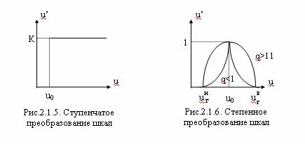 2.1. Зависимость Харрингтона 2.2. Зависимость Томашевского 3. Ступенчатая зависимость. Ступенчатое преобразование рассматривается как отношение подобия с a = К в области допустимого качества и a = 0 вне ее. При К = 1 соответственно u' = 1 в области допустимого качества и u' = 0 вне ее. Такая мера u' есть селектирующая функция области допустимого качества (рис.2.1.5). 4. Степенная зависимость. Наиболее часто используется в виде Законы функционирования систем класса АС изучены не столь тщательно и полно, чтобы по ним можно было легко определить для сформулированного показателя или критерия класс допустимых преобразований и соответствующий ему вид шкалы. В таких случаях используется следующая общая стратегия: в процессе квантификации сформулированной на качественном уровне общей цели А системы представлять сформулированные на более низком уровне иерархии составляющие ее подцели в более сильной шкале, чем представлена порождающая эту подцель цель более высокого уровня. При этом резкий переход от наиболее слабых шкал к наиболее сильным не рекомендуется, т.к. в результате такого скачка может быть просто не выявлен ряд промежуточных подцелей, оказывающих определяющее влияние на достижение общей цели А системы. Только тщательный анализ в процессе квантификации общей цели системы каждой из получаемых на более низких уровнях иерархии подцелей, проводимый вплоть до выявления на низшем уровне этой иерархии полного неизбыточного набора количественно измеримых целей и соответствующих им наборов физически измеримых параметров (характеристик) системы, которые могут быть приняты в качестве частных показателей эффективности, а также последующая оценка представительности этих показателей на основе выявления мнения ЛПР обеспечивают определение полного неизбыточного набора количественно измеримых показателей эффективности системы, с необходимой степенью доверия отображающих соответствие системы целевому назначению. |