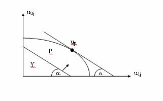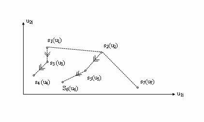 Стр. 242 Оценки систем s1 и s2 доминируют над остальными векторами соответствующих рядов и нет векторов (систем), доминирующих над ними. Вектор системы s7 не доминирует ни над каким из векторов, но и векторы других систем, доминирующие над ним, также отсутствуют. Таким образом, отношение доминирования задает на U частичный порядок и не может быть определено для некоторых uj Î U. Векторная оценка ujÎU, не доминируемая векторами uÎU, называется эффективной на множестве U. Множество Р всех эффективных на U векторных оценок называется эффективной границей множества U или множеством Парето. На рис. 2.1.8 эффективными являются векторные оценки u1, u2, u7 соответственно систем s1, s2, s7. Из этого же рисунка ясно, что оптимальная система s0ÎP={s1, s2, s7}. При этом безразлично, какой разумный смысл вкладывается в понятие оптимальности - so всегда будет принадлежать Р. Верно и обратное: для любой векторной оценки ujÎP можно подобрать разумный принцип оптимальности, по которому uj будет признана u0, т.е. принадлежащей s0 - наиболее предпочтительной системе. Какой из принципов оптимальности в наибольшей мере соответствует B, можно выяснить, только используя дополнительную информацию от ЛПР. Поэтому определение эффективной границы - это максимум того, что можно сделать в условиях многокритериальности, если ЛПР не может или не хочет раскрыть свою систему предпочтений B. В этом случае ЛПР сам анализирует множество P и выбирает из него оптимальную, по его мнению, векторную оценку u0 и соответствующую ей систему s0 без каких-либо формальных оснований. Рис. 2.1.8. Пример отношений доминирования. В теории эффективности сформулирована и доказана следующая теорема, обеспечивающая достаточно простую процедуру определения эффективной границы для целого ряда систем. Если для некоторых l i > 0, то векторная сумма uj является эффективной, где так, чтобы она пересекала множество U. Рис.2.1.9. К определению эффективной границы При увеличении константы c прямая (2.26) будет перемещаться параллельно самой себе, пока не превратится в касательную к границе множества U в точке up. Дальнейшее перемещение прямой (2.6) вверх невозможно и в точке up выполняется условие (2.25). Следовательно, up - эффективная векторная оценка, соответствующая значениям l1=a, l2=b. Повторяя описанную процедуру для всех других возможных соотношений |