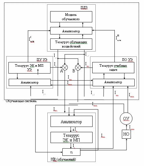Стр. 404 2. Частные цели в цикле обращения информации в системе обучения: - ОС - выработка осведомляющей информации Iвх, обеспечивающей максимальный в пределах возможностей ПИ рост его информационного кпд h; - ПИ - наиболее полное восприятие обучающей информации I0, корректура и пополнение тезауруса ЭК и МП в целях решения задач управления ОУ. Работу ПИ будем рассматривать как процесс активного перевода задач управления с языка входных ситуаций на язык принятия решений. Примем, что на вход ПИ поступает только полезная информация, что полностью соответствует специфике функционирования системы обучения и решаемой в ней задачи ОС. Принципиальная схема рассматриваемой системы обучения представлена на рис.2.3.5. Рис.2.3.5. Принципиальная схема процессов переработки информации в системе обучения Для эффективного управления работой ПИ каждая из подсистем ОС обладает анализатором, обеспечивающим перевод поступающей в нее информации на язык тезауруса подсистемы и самим тезаурусом, обеспечивающим формирование необходимой для ПИ управляющей информации. Тезаурус учебных задач содержит конечное множество S ситуаций заданий, которые образуются на конечном множестве слов А, характеризующих изучаемые УЭ, и конечном множестве слов R, отражающих отношения между ними. ПО УЭ на основе поступающей из ПДЗ управляющей информации Iу2, определяющей трудоемкость и характер учебной задачи в соответствии со спецификой функционирования ПИ, из множеств А, R формулирует семантически правильную фразу mi, представляющую собой условие учебной задачи. Тезаурус ЭК и МП эффективно функционирующего ПИ должен содержать информацию о множествах А, R, Р, где Р - дополнительное множество методов преобразования, характеризующее правила перевода mi с языка входных ситуаций на язык принятия решений. Будем считать, что каждая ситуация si учебной задачи, создающая на входе ПИ неорганизованность Овхi, однозначно описывается семантически правильной фразой mi, содержащей ni слов из множеств А и R. Пусть тезаурус ЭК и МП ПИ содержит Nэк элементов информации об ЛСМ УЭ и Nмп элементов информации об ФМ УЭ, т.е. методах преобразования и использования ЛСМ УЭ. Можно принять, что для каждого множества ситуаций S существует некоторое, назовем его оптимальным, соотношение (b) между Nэк и Nмп, при котором в вероятностью р ®1 обеспечивается правильный перевод любой si Î S, определяемой словами, входящими в тезаурус ПИ. Т.е. для mi, если ni Î Nэк, имеется такое минимальное b= 1 + Nмп/Nэк, при котором р ® 1. Исходя из этого, тезаурус ЭК и МП ПИ должен иметь эквивалентную емкость Nэ =b Nэк. |