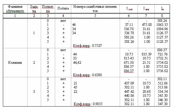 Стр. 424 Таблица 2.3.1. Типичные эмпирические данные процесса усвоения рассматриваемых УЭ обучаемым Предварительный анализ эмпирических данных состоял в выявлении общей тенденции изменения коэффициента линейной корреляции между информацией Iусв, усвоенной обучаемым, и информацией IВ, выданной обучаемому к данному моменту: УЭ1 Iэт = 588.26 бит М(К) = 0.7824 УЭ2 Iэт = 886.37 бит М(К) = 0.5428 УЭ3 Iэт = 502.11 бит М(К) = 0.8934 где М(Кr) - математическое ожидание коэффициента корреляции для данного УЭ. Общая тенденция снижения коэффициента линейной корреляции с ростом трудоемкости УЭ подтвердила нелинейный и насыщающий характер кривой обучения. Для определения вида оптимальной аналитической модели процесса усвоения (кривой обучения) были рассмотрены семь функциональных зависимостей, включающих в себя все зависимости, употребляемые в известной автору педагогической литературе для определения кривых обучения: Выбор оптимального вида модели процесса усвоения (кривой обучения) сводился к решению задачи нахождения для аппроксимирующих кривых таких уравнений, которые наилучшим образом отображают данную совокупность экспериментальных точек. Условно данную задачу называют задачей подгонки кривых или задачей уравнивания. Оптимальный вид аппроксимирующей кривой определяется методом наименьших квадратов или методом наименьших модулей. В теории имитационного моделирования рассматривается также метод ранжировки моделей. Эмпирические данные эксперимента составили 678 рядов измерений (226 обучаемых по 3 УЭ). В результате аппроксимации каждого из этих рядов всеми семью рассматриваемыми функциональными зависимостями (2.231) и оценки точности этой аппроксимации были получены обобщенные оценки, представленные в таблице 2.3.2. Таблица 2.3.2. Оценка точности аппроксимации экспериментальных данных рассматриваемыми моделями В таблице 2.3.2 в качестве критериев оценки точности аппроксимации по методу наименьших квадратов принята нормированная величина дисперсии (SD/N), а по методу наименьших модулей - нормированная сумма модулей отклонений (SM/N), где N - число рядов измерений. Номер модели в таблице 2.3.2 соответствует ее номеру в (2.231). На основании представленных в таблице 2.3.2 данных сделан вывод: в разработанной системе оценки информационных процессов в системе обучения кривая обучения (модель процесса усвоения) наиболее точно аппроксимируется полиномиальной зависимостью. |