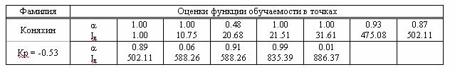 Стр. 425 Для определения вида функции обучаемости был произведен формализованный анализ эмпирических данных обучения. В основу данного анализа были положены следующие положения и допущения: 1. Расчет значения функции обучаемости в точке Iв=Iэт производился в соответствии с (2.56) при первой попытке решения задачи обучаемым, а также в случае неудачной попытки, следующей за удачной. 2. Неусвоенная к текущей попытке информация рассматривалась как "пустая" информация типа пропусков. Количество пустой информации определялось количеством информации корректуры (Iкор), необходимой для ее восполнения. 3. Информация корректуры считалась усвоенной полностью, если она не требовала последующей корректуры учебной деятельности обучаемого по преобразованию элементов графовой модели той же ветви графа, расположенных на нижележащих уровнях абстракции. В противном случае она считалась усвоенной частично. 4. Необходимость полной повторной корректуры деятельности обучаемого по одному и тому же элементу графовой модели рассматривалась как ошибка обучающего в выборе обучающего воздействия. Эти положения и допущения позволили использовать данные об информации Iкор для увеличения количества экспериментальных точечных оценок функции обучаемости, т.е. для более достоверного определения вида аппроксимирующей ее функции. Они определили логику алгоритма формализованного анализа полученных эмпирических данных и расчета экспериментальных оценок свойства обучаемости. В результате такого анализа было получено 226 рядов экспериментальных наблюдений функции обучаемости. Количество экспериментальных оценок функции обучаемости в полученных рядах наблюдений колебалось от четырех (случай идеальной учебной деятельности) до 18, среднее количество точек в ряду наблюдений составило 9.34 точки. Типичный ряд экспериментальных оценок функции обучаемости представлен в таблице 2.3.3. Данный ряд определен на основе анализа учебной деятельности обучаемого, чьи результаты обучения приведены в таблице 2.3.3. Таблица 2.3.3. Типичный ряд экспериментальных оценок функции обучаемости Предварительный анализ рядов экспериментальных оценок функций обучаемости производился на основе оценки коэффициента корреляции Кr между количеством семантической информации Io, полученной обучаемым, и экспериментальной оценкой функции обучаемости в данной точке. В рассматриваемых 226 рядах значение Кr Î [-0.93,-0.32], среднее значение коэффициента корреляции определилось величиной М (Кr) = -0.61. На основании данного анализа был сделан вывод о том, что функция обучаемости действительно представляет собой нелинейную убывающую функциональную зависимость. |