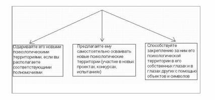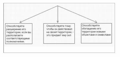 Стр. 115 1.1. Алгоритм пространственного территориями 1. Определите, что человек считает своей территорией. 2. Показывайте ему в действии, что Вы уважительно относитесь к тому, что он считает своей территорией. 3. Поощряйте территоризм различными способами: Способствуйте расширению его территории, если вы располагаете соответствующими полномочиями Способствуйте тому, чтобы он действовал на своей территории - это придает ему сил Способствуйте обогащению его территории новыми объектами и символами 1.2. Алгоритм психологического территоризма 1. Определите, что человек считает своей психологической территорией — зоной своей ответственности, компетенции, влияния. 2. Показывайте ему в действии, что Вы уважительно относитесь к тому, что он считает зоной своей ответственности, компетенции, влияния. 3. Поощряйте психологический территоризм различными способами: Одаривайте его новыми психологическими территориями, если вы располагаете соответствующими полномочиями. Предлагайте ему самостоятельно осваивать новые психологические территории (участие в новых проектах, конкурсах, испытаниях) Способствуйте закреплению за ним его психологической территории в его собственных глазах и в глазах других с помощью объектов и символов 1.3. Алгоритм пространственного антитерриторизма (СНОСКА: Алгоритмы антитерриторизма — это стратегии манипуляции или открытой войны. У нас — биологизированный тренинг, а не манипулятивный и не военизированный. Поэтому алгоритмы антитерритористического поведения даются в безличной форме, скорее как описания возможных действий противоположной стороны, нежели собственных действий. Решение о допустимости применения антитерритористической стратегии каждый принимает сам (памятуя о том, что это — манипуляция, война, нападение) и несет всю полноту ответственности за это решение.) 1. Определяется, что данный субъект считает своей территорией.  |
