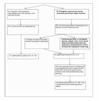 Стр. 117 4. Как соединить это с тем, что я решил сделать? 1.8. Алгоритм картины будущего 1. Определите свою цель на 5 лет вперед. 2. Ярко и выпукло нарисуйте себе картину будущего: — Кем Вы будете через 5 лет? — Какое к этому времени Вы получите дополнительное образование? — Каков будет Ваш ежемесячный доход? — Как Вы будете себя чувствовать? — Какими будут Ваши перспективы на будущее? 3. Определите, что Вы должны сделать в течение каждого из этих 5-ти лет, чтобы добиться этой цели. 4. Сформулируйте свой девиз на ближайшие 3 месяца и сделайте карточку, на которой был бы напечатан этот девиз. 5. Носите карточку с собой и доставайте ее всякий раз, когда будете чувствовать себя растерянным, обескураженным, потерявшим цель. 6. Через 3 месяца сформулируйте новый девиз. 7. Повторяйте действия по пунктам 5 и 6 еще 2 раза в течение года. 8. В конце года сопоставьте полученный результат с Вашей целью на год. 9а. Поощрите себя наиболее подходящим для себя образом, если цель достигнута. 96. Поощрите себя и в том случае, если цель достигнута лишь частично. 10а. Уточните цель на следующий год 106. Уточните свою цель на следующий год и примите на себя обязательства, сообщив как можно большему количеству людей о своей цели. Заключив договор со значимым для вас лицом о том, что в случае невыполнения вашей цели вы лишаетесь материального залога, который вы передаете этому лицу. 11а. Действуйте и далее по пп. 4—10а 116. Действуйте далее по пп. 4—8 126. Если цель достигнута, сообщите об этом доверенному лицу и верните себе свой залог. Если цель не достигнута, оставьте свой залог доверенному лицу навсегда. 136. Далее действуйте по пп. 106—126, но величину залога нужно увеличить вдвое. 1.9. Алгоритм самоисполняющихся предсказании 1. Вспомните того человека, который кажется вам недостаточно или неправильно мотивированным для его работы. |