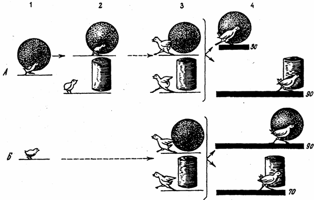 Стр. 125 В дальнейшем, уже после того, как реакция следования у цыплят совсем исчезла, у них в специальной установке были выработаны навыки следования за бывшим объектом следования – синим шаром или соответственно желтым цилиндром. Следование за этим объектом подкреплялось пищей. Другими словами, следование было заново выработано у цыплят, но путем факультативного научения. Результаты этой части эксперимента показали, что у цыплят, у которых раньше была сформирована реакция следования путем запечатления, этот навык образовался намного быстрее, чем у цыплят, которые до этого вообще не подвергались запечатлению, т.е. не имели возможности следовать за каким-либо подвижным объектом или же следовали за объектом запечатления другой группы подопытных животных (для цыплят, запечатленных на синий шар, это был желтый цилиндр и наоборот, – рис. 21). Из этих данных, казалось бы, следует, что врожденное действие (само следование), протекание которого не зависит от побочных внешних факторов и сроки проявления которого генетически фиксированы, угасает без упражнения так же, как это происходит с навыками, а с другой стороны, навык, факультативное научение, может вновь «оживить» эту инстинктивную реакцию. Объясняется это, очевидно, тем, что существует не одна, а две генетически различные, но функционально тождественные формы следования – истинно врожденная и индивидуально приобретаемая, причем вторая форма образуется путем чисто факультативного научения (ведь курица подкрепляет следование своих цыплят кормом и обогревом). Очевидно также, что первая форма со временем все больше перерастает во вторую, иными словами, реакция следования претерпевает качественную перестройку, теряя свою первоначальную врожденную сущность. Одновременно врожденное узнавание переходит в благоприобретаемое узнавание, основанное на индивидуальном опыте. Рис. 21. Формирование следования за подвижным объектом путем запечатления и факультативного научения (опыты Фабри). А – экспериментальная группа цыплят, Б – контрольная группа цыплят. 1 – выработка и тренировка реакции следования за синим шаром путем запечатления (1–4-е сутки после вылупления); 2 – первый контрольный опыт; цыплята следуют за объектом запечатления (синим шаром), но не за другим подвижным объектом (желтым цилиндром) (5-е сутки); 3 – второй контрольный опыт (26-е сутки), проведенный после трехнедельного перерыва, во время которого цыплята находились в обычных условиях, но не имели возможности видеть шар и цилиндр. В результате цыплята не только не следуют за этими движущимися объектами, но даже пугаются их. Так же реагируют на движущиеся шар и цилиндр контрольные (не подвергшиеся запечатлению) цыплята; 4 – выработка навыка следования за двигающимися шаром или желтым цилиндром при одновременном их предъявлении (27–31-е сутки) путем факультативного научения. Столбики с цифрами показывают среднее число сочетаний, необходимых для формирования устойчивого следования. |