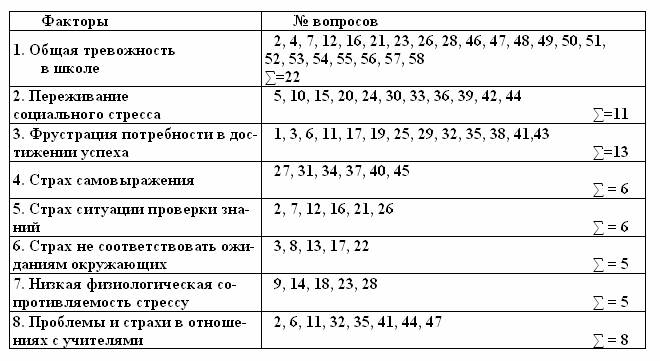 Стр. 51 Обработка и интерпретация результатовПри обработке результатов выделяют вопросы, ответы на которые не совпадают с ключом теста. Например, на 58-й вопрос ребенок ответил «да», в то время как в ключе этому вопросу соответствует «—», то есть ответ «нет». Ответы, не совпадающие с ключом, — это проявления тревожности. При обработке подсчитывается: 1. Общее число несовпадений по всему тесту. Если оно больше 50% от общего числа вопросов, можно говорить о повышенной тревожности ребенка, если больше 75% — о высокой тревожности. 2. Число совпадений по каждому из 8 видов тревожности. Уровень тревожности определяется так же, как в первом случае. Анализируется общее внутреннее эмоциональное состояние школьника, во многом определяющееся наличием тех или иных тревожных синдромов (факторов) и их количеством. Содержательная характеристика видов (факторов) тревожности1. Общая тревожность в школе — общее эмоциональное состояние ребенка, связанное с различными формами его включения в жизнь школы. 2. Переживание социального стресса — эмоциональное состояние ребенка, на фоне которого развиваются его социальные контакты (прежде всего — со сверстниками). 3. Фрустрация потребности в достижении успеха — неблагоприятный психический фон, не позволяющий ребенку развивать свои потребности в успехе, достижении высокого результата и т.д. 4. Страх самовыражения — негативные эмоциональные переживания ситуаций, сопряженных с необходимостью самораскрытия, предъявления себя другим, демонстрации своих возможностей. 5. Страх ситуации проверки знаний — негативное отношение и переживание тревоги в ситуациях проверки (особенно — публичной) знаний, достижений, возможностей. 6. Страх не соответствовать ожиданиям окружающих — ориентация на значимость других в оценке своих результатов, поступков и мыслей, тревога по поводу оценок, даваемых окружающим, ожидание негативных оценок. 7. Низкая физиологическая сопротивляемость стрессу — особенности психофизиологической организации, снижающие приспособляемость ребенка к ситуациям стрессогенного характера, повышающие вероятность неадекватного, деструктивного реагирования на тревожный фактор среды. |