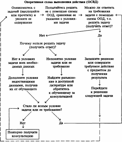 Стр. 84 Поэтому целесообразно всю эту информацию о порядке действий обучающихся выложить наглядно на ориентирующее средство, которое называется оперативной схемой выполнения действий (ОСВД). Она, в отличие от схемы ООД, относится не к конкретной деятельности, не к конкретному действию, а вообще ко всем действиям во всей учебной деятельности по решению задач (мыслительных, сенсорных, физических) с опорой на схемы ООД (см. схему 3). Такую общую, носящую принципиальный характер схему можно каждый раз конкретизировать применительно к деятельности, которой обучаются люди. Если деятельность мыслительная, то все условия той или иной задачи бывают полностью представлены в тексте последней, а если задача физическая (на двигательное действие), то эти условия предстоит выявить в материале, в тех предметах и средствах труда, с которыми придется производить определенные преобразовательные действия в ходе решения задачи. «Оперативная схема выполнения действия» показывает логику анализа задачи, направляет ход мыслительных поисков, физических или перцептивных (сенсорных) действий с условиями задачи с тем, чтобы получить требуемый (искомый) результат. Казалось бы, все есть для начала обучения: и задачи, и схемы ориентировочной основы действий, и оперативная схема выполнения действий. Однако есть еще одно препятствие, которое надо преодолеть перед тем, как приступить к занятиям. Речь идет об интеллектуальной готовности обучающихся немедленно приступить к решению задач из ранее незнакомой сферы деятельности, или, говоря иначе, начинать практически действовать в данной, новой для них сфере. Схема 3. Возможны два варианта готовности интеллектуально-познавательной сферы учащегося к новой деятельности: 1) все необходимые знания и умения для немедленного начала практических действий у всех учащихся имеются налицо и 2) часть необходимых знаний и умений в предшествующий период не были у них сформированы или сформированы не с теми качественными показателями, какие нужны для успешного выполнения предстоящей деятельности. |