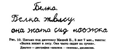 Стр. 96 Важную роль в происхождении описываемых расстройств письма играют взаимоотношения слухоречевого и речедвигательного анализаторов. Как известно, фонематический анализ может нормально осуществляться лишь на основе интеграции речевого слуха и артикуляторных кинестезии, которые взаимодополняют друг друга. У детей с дисграфией подобная интеграция развита недостаточно. Во время анализа слов они опираются только на проговаривание (т. е. на речевые кинестезии). Это значительно снижает возможность вычленения гласных звуков, как артикуляторно менее контрастных, чем согласные. В результате на письме появляются пропуски именно гласных. Сопоставление дисграфий анализа — синтеза у детей с дефектами устной речи и без них не обнаруживает различий по тяжести нарушений фонематического анализа. Зато степень зрелости предпосылок интеллекта прямым образом влияет на число ошибок. По данным И. М. Плоткиной (1978), коэффициент корреляции между результатами выполнения заданий, оценивающих предпосылки интеллекта (слухоречевая память, внимание и др.), и количеством ошибок фонематического анализа и синтеза равен 0,7, т. е. высокодостоверен. Состояние устного анализа, в свою очередь, сильно коррелирует с количеством ошибок в письме (г = 0,85). На успешность фонематического анализа, кроме способностей ребенка, влияет и языковая сложность речевого материала. Одним из определяющих факторов является длина звукоряда. При анализе ряда из 3 звуков допускается больше ошибок, чем в ряду из 2 звуков, а в ряду из 3 слогов — больше, чем в ряду из 2 слогов. Имеет значение конструкция слога: наличие стечения согласных (ССГ) резко повышает число ошибок. Таким же образом сказывается степень знакомости слова. Лена К. 7 лет 9 мес., окончила первый класс, не успевает по чтению, письму и математике. Из анамнеза: родители лишены родительских прав. Отец злоупотребляет алкоголем. В семье 5 детей, Лена — первая. Младший брат страдает расщелиной твердого неба. Девочка от первой беременности, протекавшей с токсикозом второй половины. Масса тела при рождении — 3550 г. Закричала сразу. Раннее развитие — своевременное. С 7 мес. часто болела пневмонией. Посещала ясли и детский сад. |