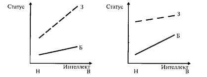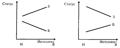 Больные дети имеют более низкий статус, чем здоровые, независимо от уровня интеллекта. Интеллектуалы имеют всегда более высокий статус (независимо от здоровья). Второй вариант: физическое здоровье при наличии высокого уровня интеллекта увеличивает шанс получить более высокий статус в группе. В этом случае получен эффект расходящегося взаимодействия двух независимых переменных. Вторая переменная усиливает влияние первой на зависимую переменную. Третий вариант: сходящееся взаимодействие — физическое здоровье уменьшает шанс интеллектуала приобрести более высокий статус в группе. Переменная "здоровье" уменьшает влияние переменной "интеллект" на зависимую переменную. Есть и другие случаи этого варианта взаимодействия: переменные взаимодействуют так, что увеличение значения первой приводит к уменьшению влияния второй с изменением знака зависимости. У больных детей, обладающих высоким уровнем интеллекта, меньше шанс получить высокий статус, чем у больных детей с низким интеллектом, а у здоровых — связь интеллекта и статуса позитивная. Теоретически возможно представить, что больные дети будут иметь больший шанс получить высокий статус при высоком уровне интеллекта, чем их здоровые низко интеллектуальные сверстники. |