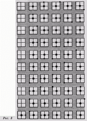 Стр. 16 Вот десять различных выражений для осязания, каждое из которых соответствует одному из наших арифметических знаков. Теперь вообразите себе доску каких угодно размеров, разделенную на маленькие размещенные горизонтально квадраты, находящиеся на одинаковом расстоянии друг от друга, как это изображено на рис. 3, и вы получите приспособление Саундерсона. Вы легко поймете, что нет такого числа, которое нельзя было бы написать на этой доске, и что, следовательно, нет такого арифметического действия, которое нельзя было бы на ней произвести. Допустим, например, что надо найти сумму, или произвести сложение, следующих девяти чисел: