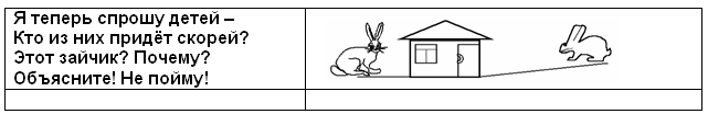 Дети объясняют, что большой зайчик прибежит раньше, так как он бежит по короткой дорожке, а маленький зайчик прибежит позже, так как он бежит по длинной дорожке.