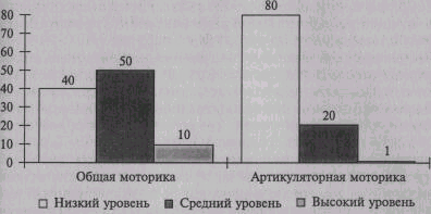Примечание. РН — дети с речевыми нарушениями; ЗД — здоровые дети; ЗД/РН — отношение показателей здоровых детей к показателям выполнения детьми со стертой дизартрией. Рис. 5. Выполнение теста на динамическую координацию детьми с речевыми нарушениями (в %): по оси абсцисс — вид моторики; по оси ординат — количество детей (в %) Можно видеть, что в среднем у детей логопедических садов вся система построения движений сформирована хуже, чем у здоровых детей в 1, 78 раза. Оценивались: 1) непроизвольная регуляция тонуса, статическая выносливость и координация (уровень А по Н.А.Бернштейну); 2) выразительные движения, мимика, пантомимика, пластика, двигательные автоматизмы (уровень В); |