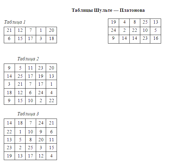 Стр. 331 Норма в пересчете на 100 букв: - время выполнения — 35, 5 ±7, 0 с; - количество ошибок — 2, 2± 1, 1. Оценка объема вниманияСм.: Полищук И. А., Видренко А. Е. Атлас для экспериментального исследования отклонений в психической деятельности человека. — Киев, 1979. Для оценки объема внимания наиболее подходят таблицы Шульте—Платонова. Все пять таблиц, имеющих различное расположение цифр, предъявляются испытуемому подряд в постоянном порядке с интервалом в несколько секунд в стандартных условиях освещения и при постоянном расстоянии от его глаз. Время поиска цифр измеряется секундомером. Обследуемому предлагается следующая инструкция: «На предлагаемой Вам таблице отыщите и покажите указкой подряд все числа от 1 до 25. Старайтесь выполнить задание как можно быстрее и без ошибок». Корректурная таблица Оценка результатов производится путем регистрации времени выполнения каждой таблицы и количества допущенных при этом ошибок (сбой в последовательности называния, перескакивание через цифру). Анализ результатов проводится путем оценки общего времени поиска цифр в каждой таблице. Сравнение результатов поиска цифр во всех пяти таблицах позволяет также характеризовать устойчивость внимания. Норма в пересчете на 100 цифр: - время выполнения — 156, 3 ±24, 7 с. |
