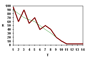 Рисунок 4. Примеры зрительных иллюзий: А - горизонтальные отрезки равны (иллюзия стрел или Мюллера-Лайера); Б – вертикальный размер кажется больше, чем горизонтальный; В – это параллельные прямые. Рисунок 5. Иллюзии восприятия пространства. А – все фигуры равны, но третья кажется значительно больше, т.к. она не уменьшилась и пересекает больше линий фона; Б – кусок вырезан из головки сыра или приставлен к ней? Рисунок 6. Кривая запоминания (обучения). N - номер повторения ряда из 20 бессмысленных слогов. К - количество воспроизведенных слогов после каждого повторения. Рисунок 7. Кривая забывания. Т - дни после полного заучивания ряда. К - количество воспроизведенных слогов (в процентах). Рисунок 8. Зависимость вероятности воспроизведения каждого слога (Р) от номера слога в ряду при воспроизведении 73% всего ряда. Рисунок 10. Зависимость школьной успеваемости от коэффициента интеллекта (принципиальная схема) Виден значительный разброс данных – низкий коэффициента интеллекта определяет низкую успеваемость, но чем IQ больше, тем эта зависимость слабее. |