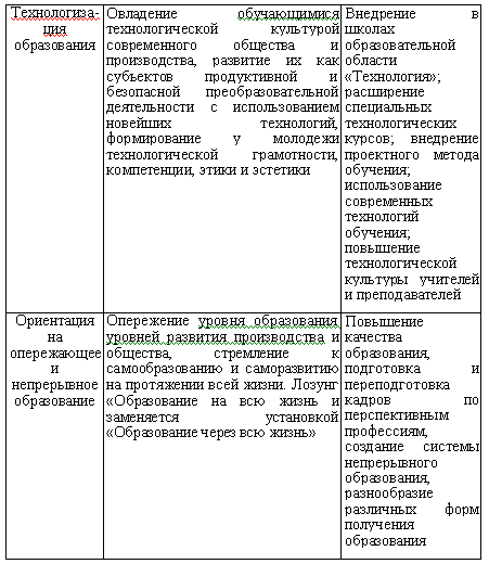 Стр. 159 Основные тенденции развития образованияТенденция (нем. Tendent, лат. tendere - направляться, стремиться) – направление развития склонности, стремления. Современные тенденции развития образования, их сущность, основные черты и пути реализации представлены в нижеследующей таблице. Эти тенденции развития присущи как отечественному, так и мировому образовательному процессу. Цели и задачи модернизации российского образованияПравительство Российской Федерации одобрило Концепцию модернизации российского образования на период до 2010 года, которая преследует цель - создание механизмов устойчивого развития системы образования. Для достижения указанной цели будут решаться следующие задачи: обеспечение государственных гарантий доступности и равных возможностей получения полноценного образования; достижение первого современного качества дошкольного, общего и профессионального образования; формирование в системе образования нормативно-правовых и организационно-экономических механизмов привлечения и использования внебюджетных ресурсов; повышение социального статуса и профессионализма работников образования, усиление их государственной и общественной поддержки; развитие образования как открытой государственно-общественной системы на основе распределения ответственности между субъектами образовательной политики и повышения роли всех участников образовательного процесса - обучающегося, педагога, родителя, образовательного учреждения. Образование становится все более мощной движущей силой экономического роста, повышения эффективности и конкурентоспособности народного хозяйства, фактором национальной безопасности, благосостояния страны и благополучия каждого гражданина. Обновленное образование должно сыграть ключевую роль в сохранении нации, ее генофонда, обеспечении устойчивого динамичного развития российского общества.— общества с высоким уровнем жизни, гражданско-правовой, профессиональной и бытовой культурой. |
