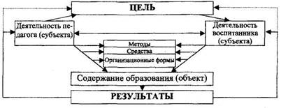 Стр. 98 Ученые считают, что «для представления о педагогической системе в статике достаточно выделения четырех взаимосвязанных компонентов: педагогов и воспитанников (субъектов), содержания образования и материальной базы (средств) (СНОСКА: Сластенин В.А. и др. Педагогика: Учеб. пособие для студ. высш. учеб. заведений. - М.: Издат. центр «Академия», 2002. - С. 131.). Педагогический процесс является динамической педагогической системой, системообразующим элементом которой выступает цель, обеспечивающая субординацию элементов системы по вертикали. По горизонтали координирует систему уровень развития и подготовленности субъектов педагогического процесса. Объектом усвоения является содержание образования, на которое направлена деятельность (взаимодействие) субъектов. Эта деятельность осуществляется с помощью методов, средств и организационных форм. Графически педагогический процесс как целостную динамическую систему можно представить следующим образом. |