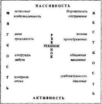 Стр. 22 После розыгрыша следующей сценки всем присутствовавшим предложили объяснить поведение Ребенка. Один из вариантов оказался точным, «в десятку», но и еще два других из пяти в какой-то степени правильны. Отец. Сними рубашку. Ребенок... (Отрицательный жест.) — Сними, жарко. — Не жарко. — Да сними же, тебе говорю, весь вспотел. — Не хочу. Не сниму. Толстоват, нескладен, стесняется своего тела; не хочет сравнения — не в его пользу; боится, что его насмерть укусит в пупок оса — прошлым летом ему этим пригрозил в шутку какой-то умник; боится какой бы то ни было обнаженности, потому что окружающие чересчур зорки, а у него есть одна постыдная тайна; не желает загара, считает, что белый цвет благороднее— «бледнолицый брат мой»; хочет, наконец, утвердить свое право быть собой хотя бы на таком маленьком пустяке... А почему же не объясняет сам? Потому что это слишком утомительно и мало надежд, что поймут, скорее изругают или подымут на смех; потому что стыдно; потому что нет подходящих слов; потому что и сам не знает... Наконец, главная игра дня — Пятый Угол. Название заимствовано от одной малосимпатичной забавы, когда несколько человек толкают одного друг к другу, из угла в угол, отвешивая при этом пинки и затрещины разной степени убедительности. Представьте себе четырехугольную площадку, расчерченную мелом, наподобие всем известных уличных «классиков», со сторонами и углами, обозначенными таким образом: Площадка эта, как легко догадаться, представляет собой Поле Отношений — координатную схему главных позиций Родителя по отношению к Ребенку, схему, конечно, предельно упрощенную. В центре — Ребенок. Родители — один или двое — где-то внутри площадки. Разыгрываются всевозможные импровизированные сценки. Переводческое Жюри с участием Ребенка прочитывает контекст поведения, и в зависимости от этого Родитель оказывается ближе то к одной стороне или углу площадки, то к другим. Задача же—попасть в центр, к Ребенку. Когда это достигается, выдается лотерейным способом какая-нибудь шуточная награда за достижение равновесия или Гармоничной Позиции. |