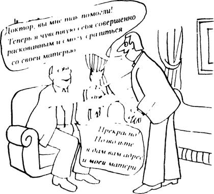 Стр. 58 Робин. Не забывайте, однако, на полюсах, по статистике, незначительный процент брачных пар. "Середину" составляет большинство. Ведь у нас, в большинстве, средний рост. Не 140 и не 195 сантиметров. Джон. Так. Я, что сразу заметно,-- из "средненьких". Ну, а полюс здоровья оккупировали, конечно же, все вы — "людоведы". Робин. Джон, шутки в сторону! Джон. Я и хотел сказать: каждый знает, что все психотерапевты психи; я насмотрелся скетчей про сумасшедших "ведов" больше, чем съел горячих обедов. Да ведь Вы не поверите! Робин. Я не думаю, что мы ненормальные. В основном мы где-то посередине шкалы. Джон. Неужели? Но как же вы тогда способны помогать людям? Робин. Это как посмотреть. Если у человека никогда не было серьезных проблем, если он никогда не испытывал боли, доставая "спрятанное за ширмой", вряд ли он сумеет помочь другим в этом. Он никогда по-настоящему не прочувствует процесс. Очень трудно полагаться на интуицию, на умственные способности, когда опыт совсем не знаком. Но я бы крайне удивился, узнай я, что нашим занятием интересуется человек абсолютно здоровый. Такой был бы с вами в кабинете сама доброта и дружелюбие, но он не стал бы специалистом. Надписи на рисунке: Больной: – Доктор, вы мне так помогли! Теперь я чувствую себя совершенно раскованным и смогу сразиться со своей матерью. Доктор: Прекрасно! Позвольте, я дам вам адрес и моей матери. Джон. Вы меня озадачили. Робин. Ну, а сами подумайте: в горах на подъеме вам поможет проводник сразу над вами, он подстрахует ваш следующий шаг. А тот, кто забрался выше вас на тысячи футов, тот вам не помощник. Джон. Да, помню, приходила такая мысль однажды, когда я слушал Кришнамурти... Знаете, я вдруг понял: я завидую этим людям, которые достигли вершины здоровья, пускай психотерапев-ты из них никудышные. |