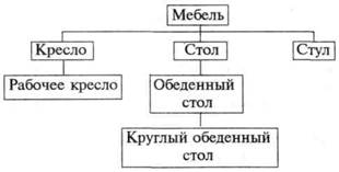 Стр. 354 12. Часть речи, глагол «приказать», основные грамматические разряды, глагол. 13. Вид государственного управления, демократия, рабовладельческая демократия в Афинах, рабовладельческая демократия. 14. Поэтическое произведение, литературное произведение, стихотворение «Два великана», стихотворение М. Ю. Лермонтова. 15. Коренное население Америки, население, индейцы, население Америки. 16. Пресмыкающееся, гадюка, змея, ядовитая змея, позвоночные. Задание 5 Задание состоит в том, чтобы расположить понятия по порядку. Однако при этом не получится простой цепочки, так как некоторые понятия будут являться родовыми по отношению не к одному, а к нескольким видовым понятиям. Например, даны понятия: «мебель, кресло, стол, стул, рабочее кресло, обеденный стол, круглый обеденный стол». Расположить эти понятия мож-но в виде следующей системы: Предлагается построить системы из следующих понятий. 1. Корень, лист, орган растения, плод, ягоды, сочный плод. 2. Железная руда, полезные ископаемые, пески, природные образования, почва, рудные полезные ископаемые. 3. Фигура, линия, угол, плоскостная фигура, многоугольник, куб, острый угол, объемная фигура. 4. Глагол, часть речи, союз, глагол сослагательного наклонения, соединительный союз, служебная часть речи. 5. Раб, угнетенный человек, крепостной крестьянин, Спартак, человек, угнетатель. 6. Стихотворение, жанр, лирическое произведение, былина, стихотворение «Парус», устное народное творчество, былина об Илье Муромце. 7. Искусство, музыка, масляная живопись, эстрадная музыка, изобразительное искусство, живопись. 8. Перелетная птица, птица, грач, позвоночные, животные организмы, млекопитающие. |