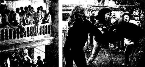 Стр. 100 При поверхностном рассмотрении эти ритуалы кажутся необычными и странными. Однако они поразительно похожи в принципе и даже в деталях на обычные церемонии посвящения в школьных братствах. Во время традиционной Адской недели, ежегодно проводимой в кампусах колледжей, студенты, давшие обещание вступить в братство, проходят через разнообразные испытания. Таким образом, старшие студенты узнают, какова физическая выдержка, психологическая стойкость и способность к социальной адаптации у новичков. В конце недели молодых людей, которые выдержали это тяжелое испытание, принимают в группу в качестве полноправных членов. Большинство «новобранцев» всего лишь очень устают, хотя иногда последствия бывают более серьезными. Интересно, что определенные ритуалы Адской недели соответствуют племенным ритуалам инициации. Вспомните, что антропологи выделяют шесть главных испытаний, которые должен выдержать инициируемый тонга во время пребывания во «дворе таинств». Внимательный просмотр газетных сообщений показывает, что каждое из этих шести испытаний имеет место и в грубых шутливых ритуалах студенческих обществ. Рис. 3.5. Легкое оцепенение Церемонии посвящения организуются в самых разных группах, однако формы самой инициации могут быть различными. Члены Голландского дискуссионного клуба (слева) издеваются над новичками, требуя от них публичного исполнения песен и декламации, в то время как женская уличная банда Восточного Лос-Анджелеса (справа) тузит нового члена Избиение. Четырнадцатилетний Майкл Калогрис провел три недели в больнице Лонг-Айленда. Мальчик получил многочисленные внутренние повреждения во время проводившейся в Адскую ночь церемонии посвящения в школьном братстве Омега Гамма Дельта. Так называемые «братья» устроили Майклу «атомную бомбу» — приказали ему поднять руки над головой, а сами тем временем наносили кулаками удары по его животу и спине. Испытание холодом. Зимней ночью Фредерика Броннера, калифорнийского студента, его будущие «братья» отвезли на высоту трех сотен футов и на расстояние десяти миль в горы в национальном парке. Оставленный в лесу, одетый только в тонкую трикотажную рубашку и хлопчатобумажные брюки, Жирный Фредди, как его прозвали, дрожал от холодного ветра до тех пор, пока не свалился в крутой овраг, сломав ногу и поранив голову. Поскольку раны не позволяли Фредерику идти дальше, он съежился от холода и вскоре умер от переохлаждения. |