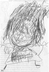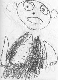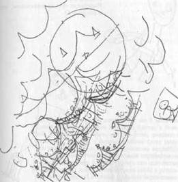 Рисунок 50 Нарисован девочкой 6 лет 2 месяцев. Неуверенная. Чрезмерно боится чужих людей. Рисунок 51 Нарисован мальчиком 9 лет. Фобии и компульсивное поведение (навязчивости). Также имеют место признаки мозговой дисфункции. Рисунок 52 Нарисован тем же мальчиком, что и рисунок 51. Рисунок 53 Нарисован мальчиком 12 лет 10 месяцев. Очень низкая успеваемость в школе. Ребенок воспитывается в плачевных условиях. Зачеркивание изображений человекаРисунок 54 нарисован девочкой 5 лет 6 месяцев. Сначала она нарисовала женскую фигуру с головой, глазами, зрачками, носом, ртом, руками и пальцами, ногами, в платье и обуви (этот рисунок соответствует ее хронологическому возрасту). Затем она энергичными штрихами перечеркнула нарисованное, как будто стремясь его полностью уничтожить. У девочки нарушения слуха в результате перенесенной матерью во время беременности коревой краснухи. Родители девочки разошлись, обстановка в доме была напряженная. Мать, доминирующая и властная, сидела дома и получала социальное пособие. Наша девочка (имеет младшего брата) — социально отзывчивый ребенок, но проявляет излишнюю вовлеченность в болезнь. Педагогу, отвечающему за программу обучения родителей, была известна атмосфера в этом доме, где эмоции просто кипят. Этот рисунок может быть интерпретирован как выражение крайне негативных чувств. Рисунок 54 |