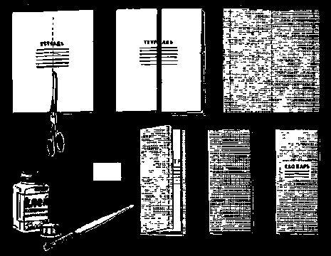Стр. 16 Девятое занятиеРечь детей на этом занятии так же, как и на предыдущем, связана, с одной стороны, с одинаковыми, неоднократно повторяющимися действиями, а с другой — с разными и более сложными действиями. На этом занятии дети делают словарики для записи трудных слов (рис. 8). Рис. 8 Учитель раздает детям все необходимое для изготовления словариков: листы из чистых тетрадей, цветную бумагу для обложки, иголки, нитки, белую бумагу для наклеивания на обложку, картинки. Сначала учитель показывает такой словарь в готовом виде и объясняет последовательный ход работы. Затем все ученики вслед за учителем выполняют по этапам всю работу. Сначала учитель делает первый элемент работы и называет его. Причем слова должны всегда сопровождать действие. Так, учитель, складывая пополам первый листок (из тетради в две косые линейки), говорит: “Видите, ребята, я складываю этот листок пополам. Смотрите, как я складываю листок от тетради пополам. Я складываю этот листочек пополам, ровно”. Детям предлагается сделать то же самое. Как только ученики начинают выполнять задание, учитель по очереди задает каждому вопросы. Учитель. Что ты делаешь? Сережа. Я складываю этот листок пополам. Учитель. А ты что делаешь, Нина? Нина. Я тоже складываю листик пополам. Учитель. Алеша, скажи, а что ты делаешь? Алеша. Я складываю свой листочек пополам. Учитель. Миша, а ты что делаешь там? Я не вижу. Миша. Я сгибаю свой листок на две ровные половинки. Затем учитель показывает детям следующую трудовую операцию. Его действие опять сопровождается словами: “Смотрите, дети, как я провожу пальцем по сгибу. Я провожу по сгибу сильно, крепко”. Когда ученики начинают делать то же самое, учитель задает детям вопросы. Учитель. Коля, что ты делаешь? Коля. Я провожу пальцем по сгибу. Учитель. А ты, Нина, что делаешь? Нина. А я сильно нажимаю пальцем там, где согнулся листочек. Учитель. Скажи, Алеша, что ты сейчас делаешь? Алеша. Я крепко провожу пальцами по сгибу листка. И так примерно говорится по поводу складывания пополам всех чистых листков и цветной обложки. Потом учитель, вкладывая в обложку первый листок, говорит: “Смотрите, как я вкладываю в обложку первый листок. Я вкладываю его ровно посредине, там, где сгиб. Видите, я вкладываю листок ровно, чтобы края его не были видны из обложки”. Ученики (повторяют вслед за учителем его действия и называют их, отвечая всякий раз на вопросы учителя. Учитель. Коля, что ты делаешь? Коля. Я вкладываю в обложку первый листок. Учитель. А ты, Сережа, что делаешь? Сережа. А я уже второй листочек вкладываю. Учитель. Скажи, Нина, что ты сейчас делаешь? Нина. Я сейчас вкладываю в середину обложки белый листочек. Учитель. А ты, Миша, что делаешь? Миша. Я вкладываю третий листок в обложку ровно посредине. Когда у каждого ученика словарь будет готов, учитель говорит, что теперь все словари нужно сшить ровно, аккуратно, посредине. В процессе работы учащихся им опять задаются вопросы. Учитель. Миша, что ты делаешь со своим словариком? Миша. Я его сшиваю. Учитель. А ты, Коля что делаешь? Коля. Я скрепляю свой словарь ниткой. Учитель. Скажи, Сережа, что ты делаешь? Сережа. А я тоже сшиваю белой ниткой свой словарь посредине. Затем учитель показывает детям, как нужно наклеить на обложку квадратик белой бумаги, на котором затем нужно будет написать, какого ученика и какого класса этот сло