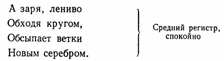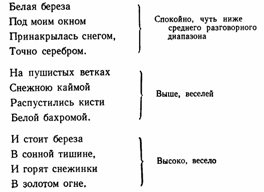 Стр. 125 Читая стихотворение А. С. Пушкина «Эхо», развивается диапазон голоса при чтении более длинных строк. На первых трех строках голос понижается, на последних трех — повышается. Ревет ли зверь в лесу глухом, Трубит ли рог, гремит ли гром, Поет ли дева за холмом — На всякий звук Свой отклик в воздухе пустом Родишь ты вдруг. Прекрасным голосовым материалом является стихотворение С. Есенина «Береза». При чтении этого стихотворения развиваются тонкие модуляции голоса при смене его регистров и изменении интонации — от минорной к мажорной. Очень мелодичны и музыкальны сказки в стихах. По своему построению и звучанию они близки к былинам, легендам. При чтении сказок в стихах речь звучит плавно, напевно. Поэтому они являются своеобразным переходным материалом между песнями и стихотворными текстами. |