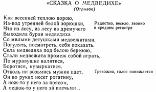 Стр. 126 Читая, например, сказки А. С. Пушкина, ребенок осуждает поповскую жадность («Сказка о попе и о работнике его Балде»), людскую корысть и неблагодарность («Сказка о рыбаке и рыбке»), жизненную несправедливость и приветствует торжество справедливости («Сказка о царе Салтане»), победу добра и любви над злом и ненавистью («Сказка о мертвой царевне и о семи богатырях»). Очень близка к народной сказке «Сказка о Медведихе», написанная с характерными народными повторами, с звонким песенным ладом. Очень близка к сказкам «Песня про купца Калашникова» М. Ю. Лермонтова. При чтении «Песни» слова как бы «нанизываются» одно на другое, звучат напевно, с плавными переходами из одной тональности в другую. На двух последних строчках голос повышается и звучит грустно,укоризненно. Сказки К. И. Чуковского («Путаница», «Топтыгин и лиса», «Мойдодыр», «Тараканище», «Федорино горе», «Айболит» и др.) написаны живо, занимательно, весело, увлекательно и являются прекрасным материалом для развития голоса. От столкновения несообразностей в его сказках возникает игра, которую весело, живо подхватывает ребенок. В сказке «Путаница» вначале все сместилось—котята захрюкали, свинки замяукали, утки заквакали, куры закрякали, воробышек замычал. А потом все образумилось, кошки замурлыкали, птицы зачирикали, лошади заржали, мухи зажужжали, лягушата заквакали, утята закрякали, а поросята захрюкали. Все звери говорят разными голосами — от высокого до низкого, от более возвышенного, возбужденного к спокойному, ровному, от громкого к тихому, слабому. Меняется темп речи,, модуляции голоса, интонационная выразительность речи—она то гневная, то ласковая, то презрительная, то восторженная, то негодующая, то восхищенная и еще с множеством разнообразных оттенков. |