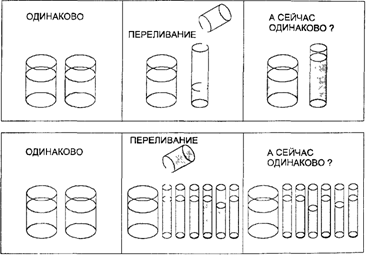 Стр. 201 Задание № 12Эксперимент на исследование понимания детьми принципа сохранения количества жидкого вещества (рис. 40). В этом эксперименте маленькому ребенку показывали два стакана и просили налить в каждый поровну подкрашенной воды. После того как ребенок проделал это, воду из одного стакана переливали в сосуд иной формы и ребенка спрашивали, осталось ли неизменным количество воды. Ж. Пиаже объяснял эти факты с помощью логической метатеории. Объяснение состоит в том, что переход от непонимания детьми принципа сохранения количества вещества к его пониманию представляет собой коренной переворот, знаменует конец до-операциональной фазы мышления и начало фазы конкретных операций. Рис.39 Рис. 40 Для этого периода характерно превращение внешне развернутых операций в интериоризированные. Главной особенностью интериоризированных конкретных операций является их обратимость: ребенок способен не только произвести в уме операцию, но также и осуществить ее в противоположном направлении, обратить. |