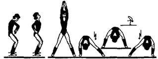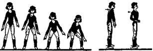 Стр. 229 7. И. п. – то же. 1 – поднять плечи вверх; 2 – «сбросить» плечи вперед (расслабленно опустить, спина слегка округлена); 3 – выпрямляясь, поднять плечи вверх; 4 – «сбросить» назад (опустить плечи вниз с небольшим круговым движением назад, слегка прогибаясь в поясничном отделе позвоночника, лопатки свести) – рис. 2.6. 8. И. п. – стойка ноги врозь, руки на голове. Движения грудной клетки вправо-влево. Голова неподвижна. 16 раз. Рис. 2.6. 9. И. п. – то же, но в полуприседе на двух ногах, руки в стороны. 16 раз. 10. И. п. – полуприсед в стойке ноги врозь, руки на бедрах. Движение грудной клетки вперед, назад с одновременным сведением и разведением локтей. 16 раз (рис. 2.7). 11. И. п. – стойка ноги врозь, руки в стороны. Движение таза вправо-влево, грудная клетка фиксирована. По 8 раз. 12. И. п. – стойка ноги врозь, но руки вперед. Движение таза вперед, назад. По 8 раз. Рис. 2.7. 13. И. п. – то же. «Рисовать» тазом «восьмерки». 16 раз. 14. И. п. – широкая стойка ноги врозь, руки вверх, ладонь одной на тыльной стороне кисти другой руки. Сгибая правую ногу, наклон вперед, руки опустить между ног; перенося тяжесть тела на обе ноги и сохраняя положение приседа, пружинящий наклон вперед; перенося тяжесть тела на левую ногу, пружинящий наклон вперед, принять и. п. 8 раз. 15. И. п. – упор стоя. Поочередное сгибание и разгибание ног. По 8–16 раз каждой ногой. 16. И. п. – упор стоя ноги врозь. Подъем на полупальцы правой ноги, таз вправо, то же левой. По 8–16 раз. 17. То же, но подъем на полупальцы обеих ног одновременно. 18. И. п. – стойка ноги врозь (стопы параллельно) – рис. 2.8. Такт I. 1 – поднимаясь на полупальцы левой ноги, правую вперед, скрестно перед левой, слегка согнутые руки вправо; и – немного спружинить на левой ноге; |