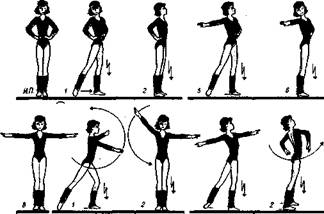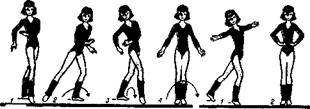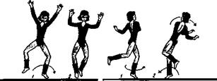 Стр. 230 Рис. 2.8. 2 – правую ногу в сторону – назад, таз вправо, слегка согнутые руки влево; 3–4 – повторить 1–2, закончить движение, приставляя правую ногу к левой, руки в стороны – вниз. Такт II. 5–8 – то же, что такт I, но с другой ноги. Такт III. 1 – с поворотом туловища налево, левую ногу назад / полуприсед на правой, руки в стороны; 2 - с поворотом направо (лицом к основному направлению) приставить правую к левой (ноги вместе), небольшой полуприсед на двух ногах, руки на пояс; 3–4 – то же с другой ноги. Такт IV. – повторить такт III. 19. И. п. – основная стойка, ноги врозь, стопы параллельно (рис. 2.9). Рис. 2.9. Такт I. 1 – скачок на левой, согнутую правую в сторону, руки в стороны – вверх, ладонями вперед, пальцы в стороны; 2 – скачок на две ноги, согнутые руки в стороны; 3–4 – то же с другой ноги. Такт II. – повторить такт I. Такт III. 1 – с поворотом налево скачок на левую ногу, правую согнутую назад, руки влево; 2 – скачок на правую, согнутую левую назад, руки вправо; 3–4 – продолжая поворот, повторить движения счета 1–2. Такт IV. – повторить такт III. Такты V–VIII – то же, но с другой ноги, поворот направо. Повторить комбинацию 4–8 раз. 20. И. п. – основная стойка, руки на поясе (рис. 2.10). Рис. 2.10. Такт I. 1 – с небольшим поворотом туловища налево шаг левой в сторону, правую в сторону на носок; 2 – приставить правую ногу к левой (и. п.); 3–4 – то же с другой ноги. Такт II. 5 – с небольшим поворотом туловища налево шаг левой в сторону, правую в сторону на носок, правую руку в сторону; 6 – приставить правую ногу к левой; |