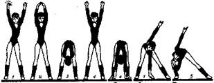 Стр. 232 3–4 – повторить 1–2. Такт VI. 5 – сохраняя полуприсед, шагом правой в сторону, стойка ноги врозь, колени вправо, согнутые руки вправо (правая рука на уровне головы, левая – на уровне талии); 6 – перевести колени и руки влево; 7–8 – повторить 5–6. Такт VII. И. п. – прыжком поворот кругом; 1–4 – повторить такт VI. Такт VIII. И. п. – прыжком поворот кругом в стойку ноги врозь; 5 – руки в стороны, предплечья вверх; 6 – полуприсед на двух ногах, спину округлить, голову наклонить вперед, предплечья опустить вниз; 7 – прогнуться в пояснице, ладони на бедрах, голова прямо; 8 – и. п. Повторить 4–8 раз. 23. И. п. – стойка ноги врозь, руки вверх (рис. 2.12). Рис. 2.12 Такт I. 1 – таз вправо, щелчок пальцами правой руки; 2 – таз влево, щелчок пальцами левой руки; и – соединить руки над головой; 3 – наклон вперед, руки опустить между ног; 4 – вернуться в и. п. Такт II. – то же, что такт I, но 4 – упор стоя. Такт III. 1 – мах правой рукой назад, поворот туловища направо; 2 – упор стоя; 3–4 – то же другой рукой. Такт IV. 5 – выпад вправо с наклоном вперед, левая рука согнута, ладонью опирается о колено правой ноги, правая рука назад; 6 – пружинящий наклон вперед с рывковым движением правой руки назад; 7–8 – то же в другую сторону. Повторить 4–8 раз. ЗАКЛЮЧИТЕЛЬНАЯ ЧАСТЬ Упражнение 1. «Создание образа «Я» методом магического танца» «Вначале встаньте, глядя прямо перед собой. Выберите опорную ногу, поднимите стопу другой ноги назад и возьмитесь за нее рукой. Другую руку вытяните вперед и вверх. Смотрите прямо перед собой, это поможет вам сохранить равновесие. Теперь наклонитесь вперед и поднимите вверх ногу, стопу которой держите, настолько, насколько это возможно. Представьте себя танцором, выполняющим прыжки сознания из одной реальности в другую. |