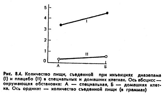 Стр. 279 Эксперимент проводился на 15 крысах, применялась кросс-индивидуальная схема позиционного уравнивания. Инъекции производились за 15 минут до опыта. «Перед опытом в специальную или домашнюю клетку помещалось 20 (±5) граммов пищи (точный вес был известен), а после опыта взвешивалась несъеденная пища и оставшиеся крошки» (Вайз и Досан, 1974, с. 931 — 932). На рис. 8.4 сравнивается количество съеденной пищи при инъекциях диазепама и плацебо. Легко убедиться, что при инъекции диазепама крысы съедали гораздо больше. При тех и других инъекциях в домашней клетке пищи съедалось несколько больше, чем в специальной. Взаимодействие было почти нулевым. Таким образом, разница в количестве съеденной пищи при инъекции диазепама и без него оказалась весьма значительной как в специальной, так и в домашней клетках (в последней — чуть больше). Следовательно, действие диазепама было непосредственным, независимым от снятия тревожности. Это не значит, что связь уменьшения тревожности с повышением аппетита полностью отрицается. Однако если основной результат действий окружающей обстановки (специальная или домашняя клетка) составил лишь 0,7 (грамма), то основной результат действия диазепама был равен 3,5 (грамма). Мы рассказали лишь об одном из многих экспериментов, вошедших в обширное исследование Вайза и Досан (1974). Проверка гипотезы о непосредственном специфическом действии диазепама на пищевое поведение была общей задачей этого исследования. А в данном, только что описанном эксперименте проверялась альтернативная гипотеза: результат воздействия является не простым, а комбинированным, связанным с двумя переменными — самим введением диазепама и обстановкой, вызывающей тревожность. Но чтобы разделить эти две гипотезы, не обязательно ставить факторный эксперимент. Для проверки гипотезы о снятии тревожности достаточно провести все опыты только в домашних клетках. Мы можем убедиться в этом по следующим диаграммам. Рассмотрим, во-первых, опыты в специальных клетках. |
