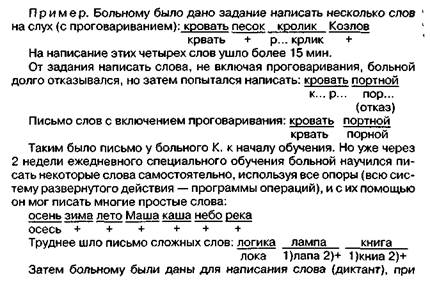 Стр. 162 В грубых случаях нарушения письма опора на одно лишь проговаривание оказывается недостаточной. Действие в этих случаях может оказаться выполненным лишь при условии реализации последовательной серии операций, делающей письмо слова чрезвычайно развернутым и вынесенным вовне процессом. Наш больной в начале обучения каждое слово писал от 3 до 5 мин.: он проговаривал каждый слог слова (часто возвращаясь к нему), отбивал рукой (или ногой) ритмическую структуру слова, выкладывал нужное количество фишек, соответствующее количеству слогов, затем проговаривал каждый звук внутри слова, находил соответствующую букву и т.д. Заканчивался такой развернутый анализ состава слова его списыванием, письмом по следам. При этом он часто прибегал к зрительной опоре на оральный образ звука. этом не разрешалось использовать разрезную азбуку. В этом случае увеличилось количество ошибок и время письма: Из протокола видно, что исключение из программы одной из операций сильно осложняло процесс письма, что указывает на необходимость последовательного выполнения всех операций. Постепенно действие письма больного сокращалось: он проговаривал слово только по слогам (опустив побуквенное проговаривание), почти исключил опору на пальцы при количественном анализе состава слова, проговаривание стало короче (без повторений). В связи с этим увеличилась скорость письма. К концу второй недели обучения больной усвоил способ письма отдельных слов и стал пользоваться им самостоятельно. Сам способ (программа) значительно сократился. Многие слова больной писал при шепотном проговаривании. После очевидного успеха больного начали обучать письму целых фраз. Работа над фразой шла параллельно с работой над восстановлением устной речи. К концу 2-го месяца обучения больной мог писать небольшие диктанты. Например: «Осень. Листья пожелтели. Идет дождь. Под ногами грязь. На небе грозные тучи». Простые слова он писал уже почти всегда молча, при письме более сложных слов включал шепотную речь, а в трудных случаях обязательно прибегал к громкому проговариванию. Последний способ был не единственным из оставшихся внешних опор при письме. При больших по объему и трудных по составу диктантах или при самостоятельном письме больной прибегал не только к проговариванию, но и к подсчету звуков при помощи пальцев или графической схемы. При этом письмо было почти безошибочным. Автоматизации навыков письма на уровне «в уме» нам не удалось получить, хотя процесс письма стал значительно более сокращенным по составу входящих в него вспомогательных операций и протекал быстрее. Если в начале обучения больному требовалось для написания четырех слов 15 мин., а для фразы, состоящей из трех слов, 12 минут, то в конце обучения больной за 15 мин. писал 30 слов, а за 12 минут мог написать 4—5 предложений из трех слов каждое. На иллюстрации показана динамика письма в процессе обучения больного (рис. 3). |