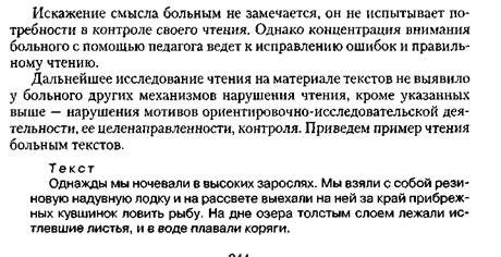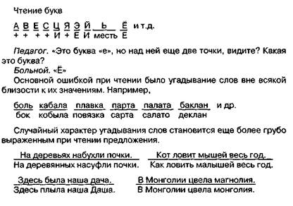 Стр. 247 Исследование влияния уровня контекста на процесс чтения у больных с поражением лобных систем мозга показало, что контекст не оказывает влияния на их процесс чтения: скорость чтения текстов с высоким уровнем контекста не увеличивается и количество ошибок не уменьшается. Приведем выписки из протоколов. Больной Г., 56 лет, образование 7 классов, был оперирован по поводу опухоли головного мозга. На операции была вскрыта внутримозговая киста левой лобной доли. Исследование чтения отдельных букв выявило ошибки, в основе которых лежала нестойкость внимания. Отдельные буквы воспринимались им глобально, а те «микрознаки», которые нередко являются существенным признаком буквы, отличающим ее от другой, похожей буквы, остаются незамеченными им. Концентрируя внимание больного на этих деталях буквы, можно добиться правильного называния (чтения) буквы. Чтение больного Однажды мы ночевали в высоких халори. Мы взяли с собой резиновую дедушкину подушку и на рассвете выехали на ней за край прежних кувшиновых ловить рыбу. На дне озера толстым плоем бежали истлевшие листья и в воде плавали коряги. Анализ чтения больного и характера его ошибок показал, что у больного, несмотря на отсутствие первичных дефектов в чтении, на первичную сохранность сенсо-моторного уровня, оказывается нарушенным понимание читаемого. Это обнаружилось в специальных опытах, в которых от больного требовалось найти картинки, соответствующие содержанию предложений и текста. В этих опытах больной не смог выполнить задания, он всякий раз подбирал картинки не по смыслу предложения (или текста), а по отдельным его словам. Процесс понимания текста носил фрагментарный характер, больной не мог оценить смысла целого, а устанавливал лишь непосредственную связь между значениями отдельных слов и соответствующими элементами в картинке. Полученные данные позволяют считать, что поражение левой лобной доли может привести к нарушению чтения как деятельности, несмотря на сохранность аналитико-синтетических операций чтения. Здесь нарушается уровень понимания, но уже не из-за дефектов в звене звуко-буквенного анализа или кратковременной памяти, а в звене смысловых догадок и контроля. Эти звенья, в свою очередь, оказываются дефектными из-за нарушения высших форм поведения больного и в целом — целенаправленной деятельности. Восстановительное обучение в этих случаях должно быть направлено на организацию поведения больного в момент протекания процесса чтения: на создание мотивов деятельности, на организацию ориентировочно-исследовательской деятельности, стратегии и контроля. |