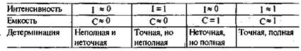 Стр. 164 Если значения этих характеристик выразить в процентах (что очень удобно для интерпретации), то для нашего примера (см. таблицу 3.3.1 или первую табличку на схеме 3.4.2): Тогда I (С®У) = 30%, а С (С®У) = 24%. Из первого значения делаем вывод, что из числа студентов, обладающих свойством С (быть социологом), 30% обладают свойством У (быть удовлетворенным). Интенсивность выражает как бы точность детерминации. Из значения емкости делаем вывод, что из числа студентов, обладающих свойством У, 24% обладают свойством С. Емкость выражает в дополнение к интенсивности как бы полноту детерминации. Интенсивность и емкость обладают свойствами, на основе которых достаточно легко интерпретировать детерминацию. Ниже предлагается примерная схема совместной интерпретации значений этих характеристик детерминации. Схема 3.4.3. Интерпретация детерминации Еще один способ анализа таблицы (2*2) О статистической зависимости можно судить по таблицам, приведенным на схеме 3.4.2, и без использования коэффициентов. Ведь относительные частоты в долях (частости) являются оценками вероятности некоторых событий. Например, обозначим через Р(У,П)вероятность события «быть в будущем политологом и одновременно быть удовлетворенным учебой на четыре балла», через Р(У) ¾ вероятность события «быть удовлетворенным на четыре балла», через Р(П) ¾ вероятность события «быть в будущем политологом». Известно, что если два последних события независимы, то Р(У,П)-=Р(У)*Р(П). Для нашего примера (см. таблицу 3.4.1) Р(У)=250/ 1000=0,25; Р(П)=100/1000=0,1; Р(У,П)=30/1000=0,3. Различие небольшое, поэтому события У и П, скорее всего, независимы. Для локальной связи пригодны и любые другие меры, существующие для таблиц сопряженности любого размера (r * s), т. е. когда число строк в таблице равно r, а число столбцов равно s. Прежде чем перейти к ним, приведем пример использования на практике дихотомических пар понятий: истинное ¾ ложное значение коэффициента связи; непосредственная связь ¾ опосредованная связь. |