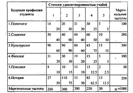 Стр. 167 Упомянутый выше «язык» анализа локальных связей ¾ язык детерминации ¾ достаточно легко переводится и на многомерный случай. Однако к работе [13] следует обращаться, имея определенный уровень математической подготовки. Меры связи, основанные на c2 (хи-квадрат) Представим себе, как будет выглядеть наша таблица сопряженности в ситуации статистической независимости между феноменами «будущая профессия» и «удовлетворенность учебой». Нетрудно вспомнить, что при статистической независимости, например, для частоты в ячейке (1,4) выполняется соотношение: Если теперь записать это в общем виде, т. е. для любой ячейки (i j), то в случае статистической независимости будет верно соотношение: