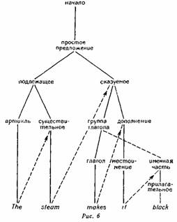 Стр. 181 Поскольку в процессе преобразования Существительного в steam в кратковременную память не поступает никаких новых символов, программа предписывает возвращение к символу Сказуемое и движение по левой ветви до тех пор, пока не будет получено слово makes. На этом этапе в кратковременной памяти будет храниться символ Дополнение в результате деления Сказуемого на Группу глагола и Дополнение, а затем и «отложенная» разрывная составляющая Именная часть, возникшая в результате переписывания Группы глагола как Глагол и Именная часть. В типичном случае нужно было бы вернуться к символу Именная часть, как к последнему символу, поступившему в кратковременную память, но благодаря отмеченной «задержке» программа возвращается, как показано пунктирной линией, к символу Дополнение. Только после того, как будет напечатано слово it, программа возвращается к преобразованию Именной части вплоть до получения слова black. Цель этой программы заключается в порождении слов предложения в окончательном виде, слева направо, в рамках общей синтаксической структуры предложения. Наиболее важным следствием модели Пнгве является то, что при порождении каждого слова возникают определенные обязательства, выражающиеся в числе символов, которые должны храниться в кратковременной памяти и затем пройти дальнейшее преобразование. В примере, изображенном на рис. 6, в момент получения The в кратковременную память поступило два символа (Сказуемое и Существительное), при получении steam — только один символ (Сказуемое), при получе-; mm makes — два символа (Дополнение и Именная часть), при слове it — один символ (Именная часть), а при слове black ни одного символа. Это число хранящихся в памяти единиц Ингве называет «глубиной» слова. Он утверждает, что для любого устройства с ограниченной памятью существует предел числа единиц, которые могут храниться одновременно. Для человеческой памяти, по предположению Ингве, вероятным пределом является примерно семь единиц, что совпадает со средним объемом памяти, то есть с числом единиц, которые человек может запомнить или воспроизвести в течение короткого периода времени, например номер телефона (более подробно этот феномен рассмотрен в известной статье Дж. Миллера о «магическом числе 7»; 1965). Из этого следует, что любое предложение, требующее хранения |