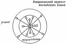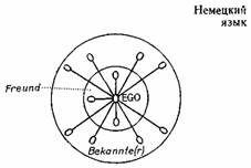 Стр. 84 называем друзьями, тех, кто попадает во внешний круг, — знакомыми. Относительная длина линии, соединяющей говорящего с другими людьми (обозначенными маленькими кружками), отражает социальную дистанцию. Схемы для американского варианта английского языка и немецкого языка практически совпадают, за исключением расположения внутреннего круга, являющегося границей между двумя понятиями. Итак, в обоих случаях мы имеем дело с говорящим («эго») и рядом конкретных людей, стоящих на определенной социальной дистанции от него. Сравним английские термины с их немецкими эквивалентами, Freund и Bekannter (или, для обозначения женщины, Bekannte). Эти немецкие термины переводятся соответственно «друг» и «знакомый», но, как показывает Дайболд, имеют различия в употреблении. Приведенная ниже схема показывает, что в немецком языке слово Freund относится к более близким «друзьям», чем в английском, то есть многие люди, которые американцы называют друзьями, для немца были бы всего лишь знакомыми. Заметим, что наборы людей, представленных в американской и немецкой схемах, идентичны, но дефиниции терминов различны. Весьма трудно определить тот семантический «компонент», который обусловливает различие между американским friend и немецким Freund. И опять-таки различие в данном случае связано скорее со степенью или позицией относительно каких-то координат. Опыт применения разнообразных видов семантического анализа говорит о том, что приятие семантических компонентов, или семантических аксиом, очень полезно для анализа. Нам еще далеко до получения адекватного описания системы семантических универсалий, но уже сейчас ясно, что некоторые из них будут дискретными категориями, сходными с теми компонентами, которые выделяются в ходе компонентного анализа. Некоторые из них, возможно, будут представлять собой параметры (как статус, социальная дистанция, положение в спектре цветов и т. п.). Я лично не уверен, что вся семантическая информация о слове может быть организована по принципу «плюс — минус», то есть может строиться на наличии или отсутствии данного признака, как в системе дифференциальных признаков в фонологии. Однако именно на этом предположении строятся многие современные семантические теории. Компонентный анализ, наряду с другими многочисленными методами, разработанными полевой антропологией для выявления терминов и их группировки (в виде категорий, иерархий, контрастных рядов и т. д.), может внести важный вклад в понимание природы семантической структуры. |