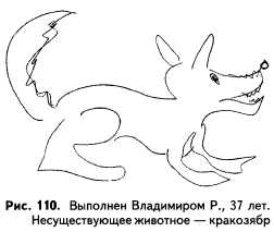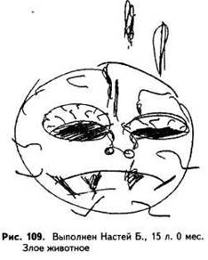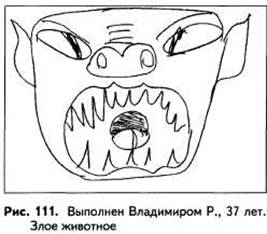 Стр. 105 Единственное, что сообщила девочка об этом персонаже, это что он «питается разными животными». В его изображении почти отсутствует символика агрессии (имеются лишь подчеркнутые зубы – признак вербальной агрессии). Признаки же страха становятся гораздо более выраженными, чем в предшествующем рисунке (огромные глаза с очень большой зачерненной радужкой). Густая штриховка (зачер-нение) зубов говорит о том, что тема агрессии, даже чисто вербальной, вызывает высокую эмоциональную напряженность. Принципиально другой тип реакции на эмоциональную нагрузку наблюдается у тридцатисемилетнего Владимира Р. По стандартной инструкции он изобразил «кракозябра» (рис. 110). Рисунок злого и страшного животного сделан гораздо более твердой и уверенной линией, с сильным нажимом. Все линии доведены до конца (рис. 111). Увеличенный размер рисунка говорит об актуализации тревоги. Однако это не невротическая тревога, разрушающая деятельность, как в ранее рассмотренных материалах, а, напротив, стеничная мобилизующая тревога, представляющая собой адекватную, позитивную реакцию на стресс. Таким образом, у Владимира высока устойчивость к стрессу, для него характерна стеничная реакция на эмоциональную нагрузку. |