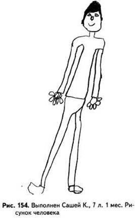 Стр. 135 В период обследования Владимир находился в процессе развода с женой. Острая эмоциональная реакция, связанная с семейной тематикой, проявилась у него не только в особенностях изображения, но и в отклонении от инструкции. Вместо того чтобы в соответствии с заданием нарисовать семью, состоящую из разных животных, он изобразил семью из одинаковых животных (собак). КОНФЛИКТНЫЕ ОТНОШЕНИЯ В СЕМЬЕУ семилетнего Саши К. в рисунке семьи представлена сплоченная группа, состоящая из бабушки, У папы не нарисованы кисти рук, что сигнализирует об отсутствии или недостаточности содержательного общения с Сашей. Исходя из того, что мальчик изобразил его ближе всех к себе и с самой крупной головой, можно предположить, что отец для него – очень значимая фигура. Возможно, напряженное отношение к нему вызвано именно недостаточностью общения. |